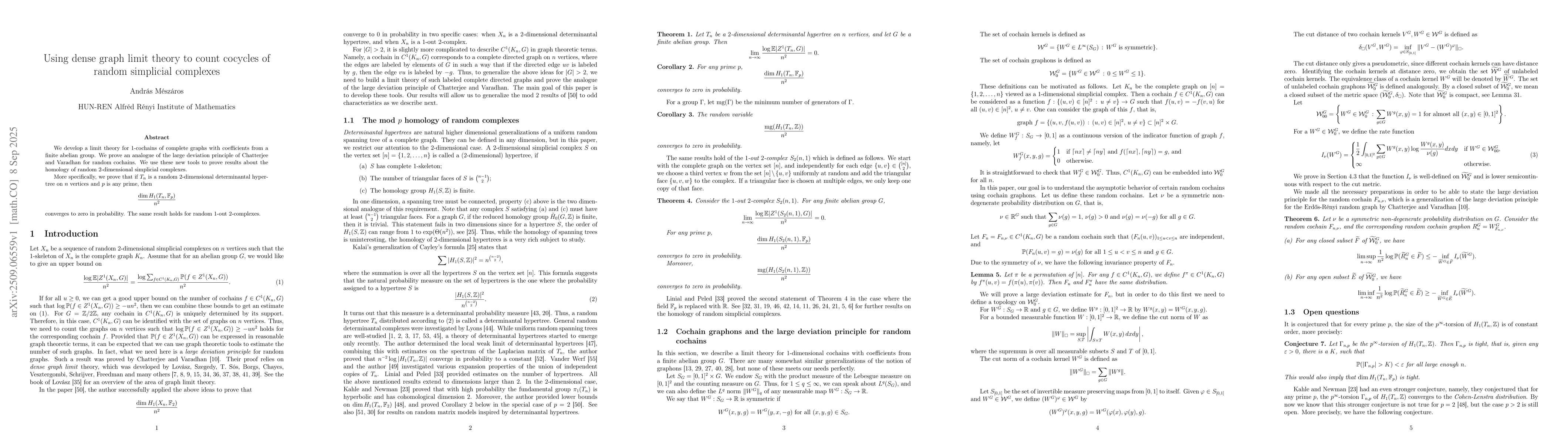 We develop a limit theory for $1$-cochains of complete graphs with coefficients from a finite abelian group. We prove an analogue of the large deviation principle of Chatterjee and Varadhan for random cochains. We use these new tools to prove results about the homology of random $2$-dimensional simplicial complexes. More specifically, we prove that if $T_n$ is a random $2$-dimensional determinantal hypertree on $n$ vertices and $p$ is any prime, then \[\frac{\dim H_1(T_n,\mathbb{F}_p)}{n^2}\] converges to zero in probability. The same result holds for random $1$-out 2-complexes.