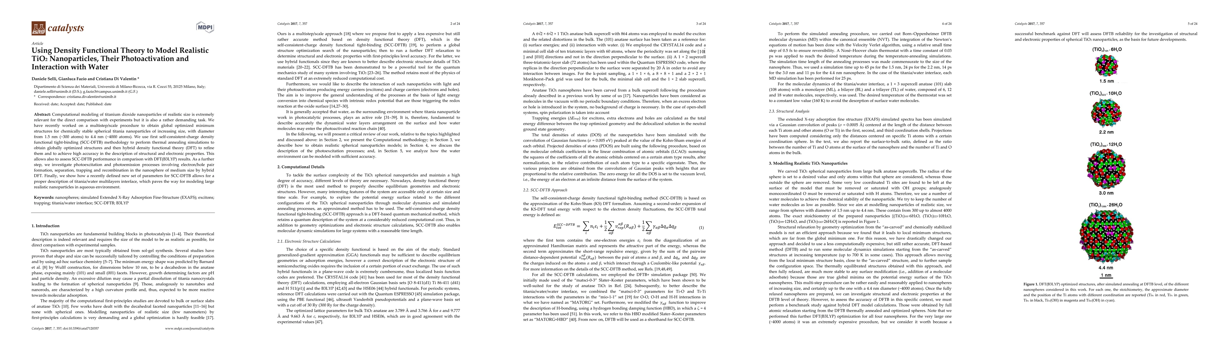Computational modeling of titanium dioxide nanoparticles of realistic size is extremely relevant for the direct comparison with experiments but it is also a rather demanding task. We have recently worked on a multistep/scale procedure to obtain global optimized minimum structures for chemically stable spherical titania nanoparticles of increasing size, with diameter from 1.5 nm (~300 atoms) to 4.4 nm (~4000 atoms). We use first self-consistent-charge density functional tight-binding (SCC-DFTB) methodology to perform thermal annealing simulations to obtain globally optimized structures and then hybrid density functional theory (DFT) to refine them and to achieve high accuracy in the description of structural and electronic properties. This allows also to assess SCC-DFTB performance in comparison with DFT(B3LYP) results. As a further step, we investigate photoexcitation and photoemission processes involving electron/hole pair formation, separation, trapping and recombination in the nanosphere of medium size by hybrid DFT. Finally, we show how a recently defined new set of parameters for SCC-DFTB allows for a proper description of titania/water multilayers interface, which paves the way for modeling large realistic nanoparticles in aqueous environment.