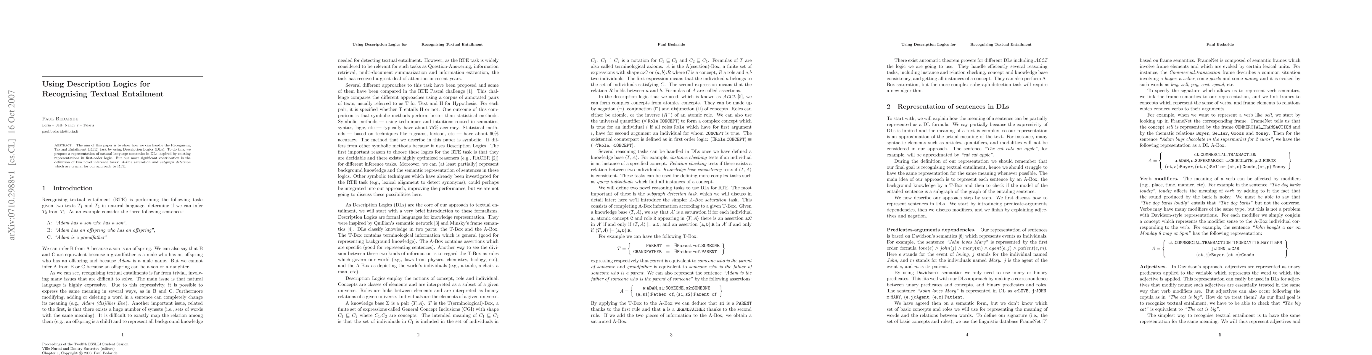 This paper proposes using Description Logics (DLs) to tackle the Recognising Textual Entailment (RTE) task, introducing a novel representation of natural language semantics in DLs. The key innovation is the definition of two new inference tasks, A-Box saturation and subgraph detection, essential for the proposed RTE approach.