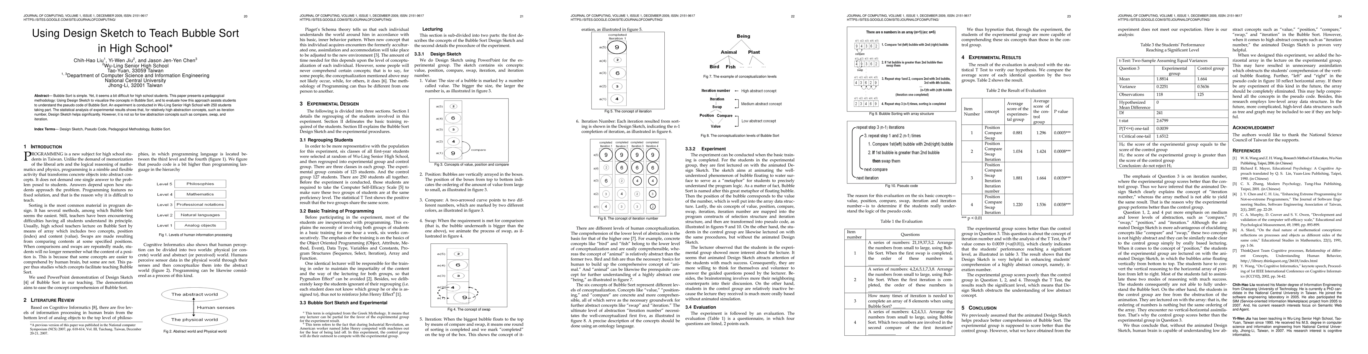 This study found that using Design Sketch to visualize Bubble Sort concepts improved understanding for high school students with abstract ideas like iteration numbers, but not so much for concrete concepts like comparing and swapping variables.