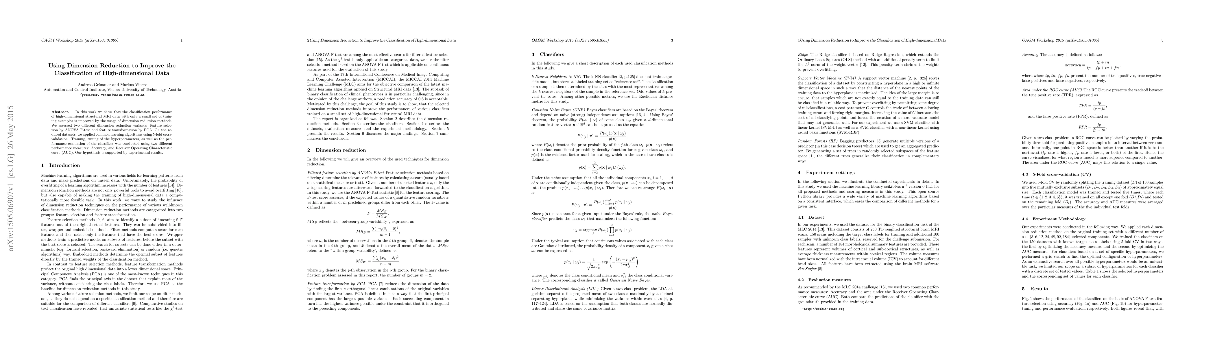 In this work we show that the classification performance of high-dimensional structural MRI data with only a small set of training examples is improved by the usage of dimension reduction methods. We assessed two different dimension reduction variants: feature selection by ANOVA F-test and feature transformation by PCA. On the reduced datasets, we applied common learning algorithms using 5-fold cross-validation. Training, tuning of the hyperparameters, as well as the performance evaluation of the classifiers was conducted using two different performance measures: Accuracy, and Receiver Operating Characteristic curve (AUC). Our hypothesis is supported by experimental results.