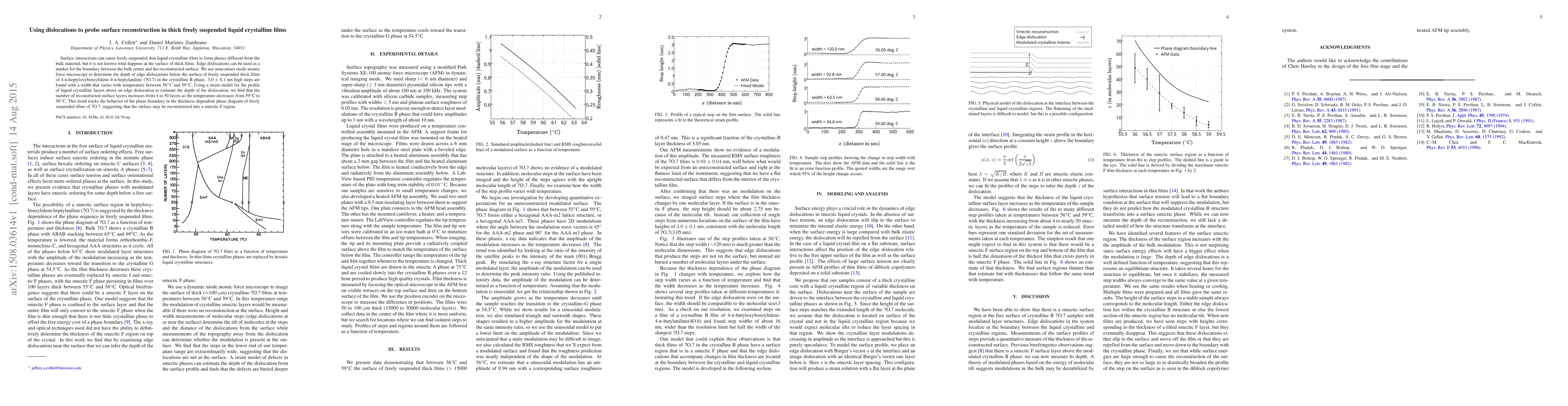 Surface interactions can cause freely suspended thin liquid crystalline films to form phases different from the bulk material, but it is not known what happens at the surface of thick films. Edge dislocations can be used as a marker for the boundary between the bulk center and the reconstructed surface. We use noncontact mode atomic force microscopy to determine the depth of edge dislocations below the surface of freely suspended thick films of 4-n-heptyloxybenzylidene-4-n-heptylaniline (7O.7) in the crystalline B phase. 3.0 +/- 0.1 nm high steps are found with a width that varies with temperature between 56 C and 59 C. Using a strain model for the profile of liquid crystalline layers above an edge dislocation to estimate the depth of the dislocation, we find that the number of reconstructed surface layers increases from 4 to 50 layers as the temperature decreases from 59 C to 56 C. This trend tracks the behavior of the phase boundary in the thickness dependent phase diagram of freely suspended films of 7O.7, suggesting that the surface may be reconstructed into a smectic F region.