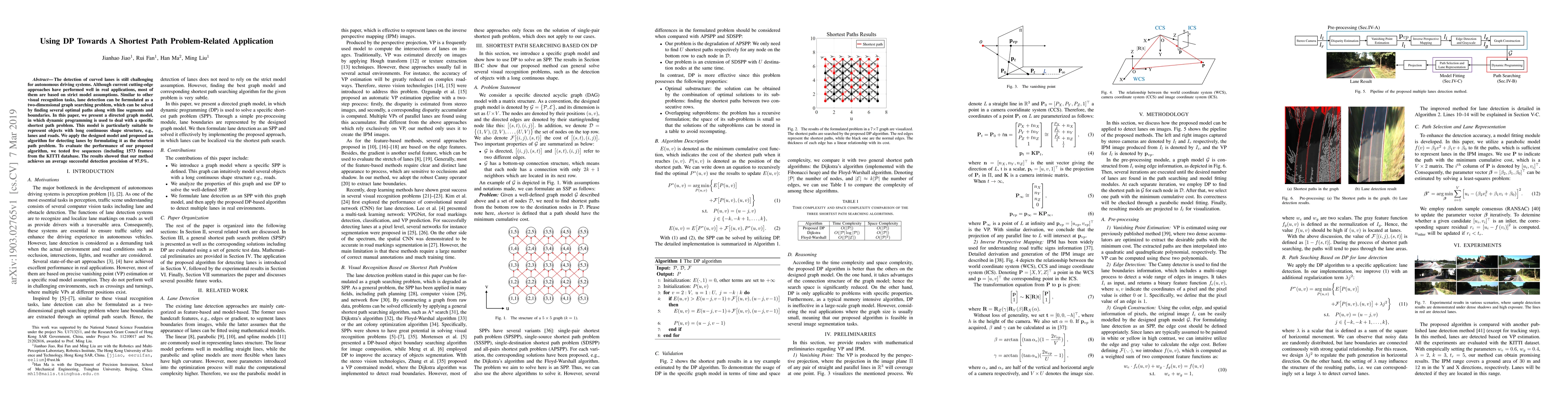The detection of curved lanes is still challenging for autonomous driving systems. Although current cutting-edge approaches have performed well in real applications, most of them are based on strict model assumptions. Similar to other visual recognition tasks, lane detection can be formulated as a two-dimensional graph searching problem, which can be solved by finding several optimal paths along with line segments and boundaries. In this paper, we present a directed graph model, in which dynamic programming is used to deal with a specific shortest path problem. This model is particularly suitable to represent objects with long continuous shape structure, e.g., lanes and roads. We apply the designed model and proposed an algorithm for detecting lanes by formulating it as the shortest path problem. To evaluate the performance of our proposed algorithm, we tested five sequences (including 1573 frames) from the KITTI database. The results showed that our method achieves an average successful detection precision of 97.5%.