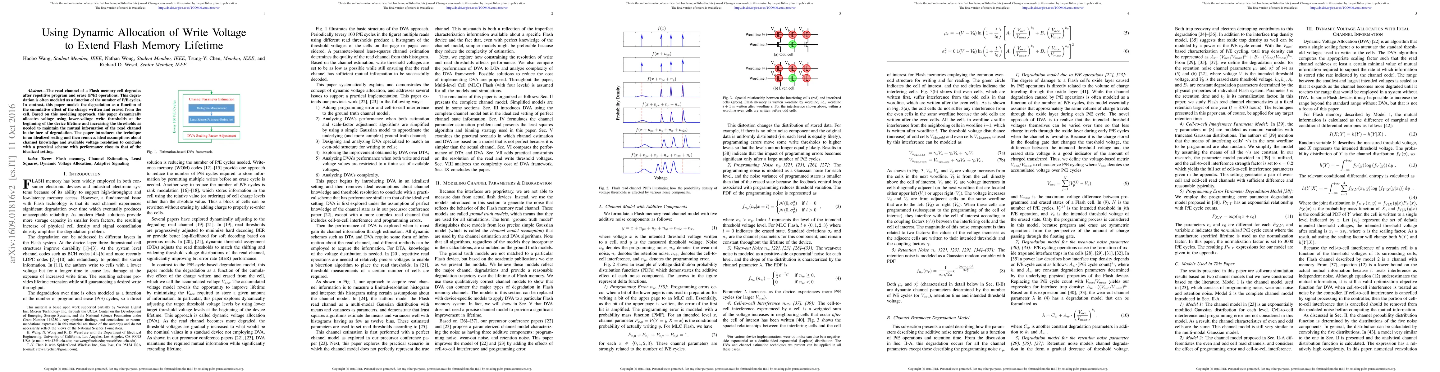 The read channel of a Flash memory cell degrades after repetitive program and erase (P/E) operations. This degradation is often modeled as a function of the number of P/E cycles. In contrast, this paper models the degradation as a function of the cumulative effect of the charge written and erased from the cell. Based on this modeling approach, this paper dynamically allocates voltage using lower-voltage write thresholds at the beginning of the device lifetime and increasing the thresholds as needed to maintain the mutual information of the read channel in the face of degradation. The paper introduces the technique in an idealized setting and then removes ideal assumptions about channel knowledge and available voltage resolution to conclude with a practical scheme with performance close to that of the idealized setting.