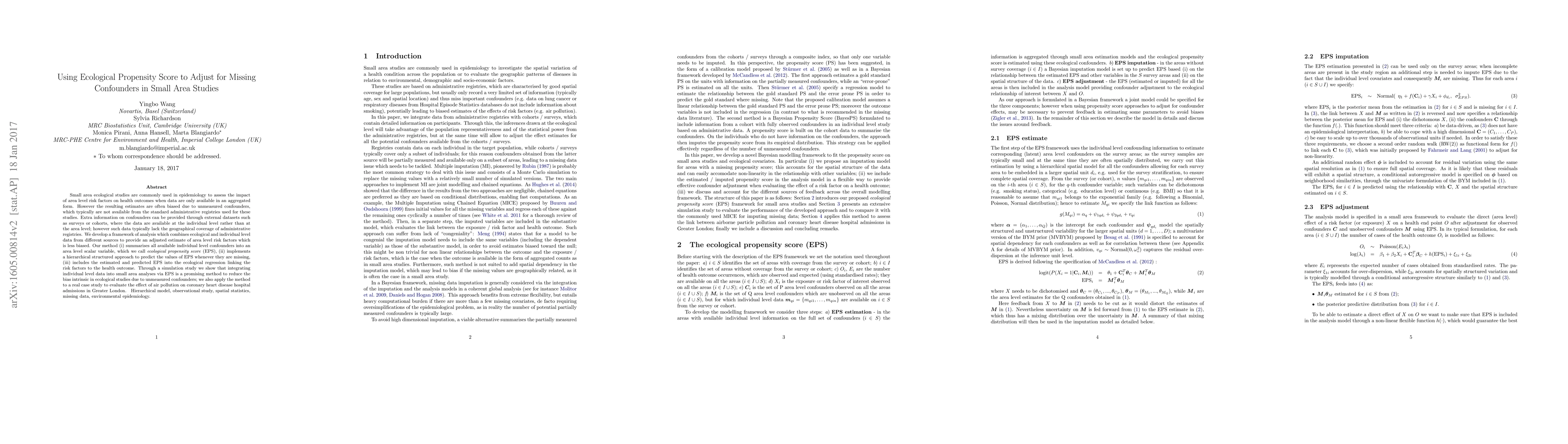 Small area ecological studies are commonly used in epidemiology to assess the impact of area level risk factors on health outcomes when data are only available in an aggregated form. However the resulting estimates are often biased due to unmeasured confounders, which typically are not available from the standard administrative registries used for these studies. Extra information on confounders can be provided through external datasets such as surveys or cohorts, where the data are available at the individual level rather than at the area level; however such data typically lack the geographical coverage of administrative registries. We develop a framework of analysis which combines ecological and individual level data from different sources to provide an adjusted estimate of area level risk factors which is less biased. Our method (i) summarises all available individual level confounders into an area level scalar variable, which we call ecological propensity score (EPS), (ii) implements a hierarchical structured approach to predict the values of EPS whenever they are missing, (iii) includes the estimated and predicted EPS into the ecological regression linking the risk factors to the health outcome. Through a simulation study we show that integrating individual level data into small area analyses via EPS is a promising method to reduce the bias intrinsic in ecological studies due to unmeasured confounders; we also apply the method to a real case study to evaluate the effect of air pollution on coronary heart disease hospital admissions in Greater London.