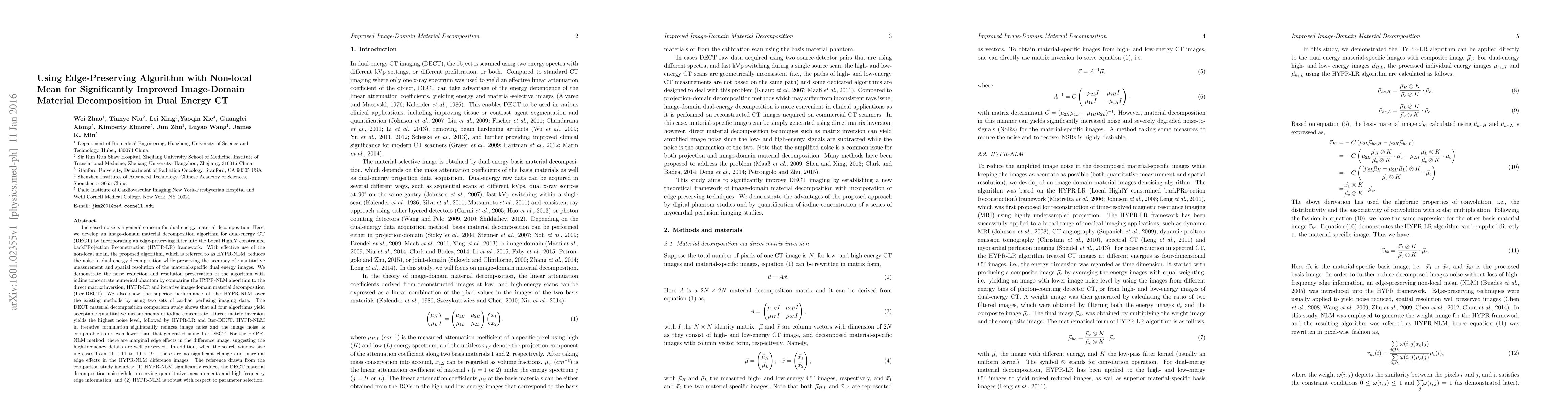 This paper proposes an edge-preserving algorithm, HYPR-NLM, for dual-energy CT material decomposition that combines a local reconstruction framework with non-local mean filtering. The method demonstrates significant noise reduction and maintains spatial resolution and quantitative accuracy compared to existing techniques.