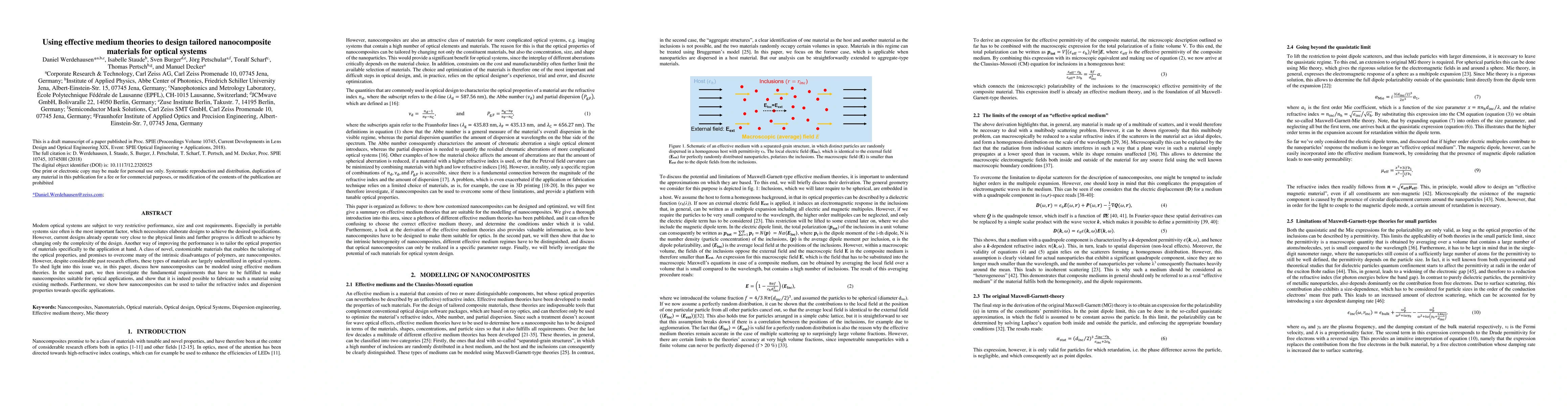 Modern optical systems are subject to very restrictive performance, size and cost requirements. Especially in portable systems size often is the most important factor, which necessitates elaborate designs to achieve the desired specifications. However, current designs already operate very close to the physical limits and further progress is difficult to achieve by changing only the complexity of the design. Another way of improving the performance is to tailor the optical properties of materials specifically to the application at hand. A class of novel, customizable materials that enables the tailoring of the optical properties, and promises to overcome many of the intrinsic disadvantages of polymers, are nanocomposites. However, despite considerable past research efforts, these types of materials are largely underutilized in optical systems. To shed light into this issue we, in this paper, discuss how nanocomposites can be modeled using effective medium theories. In the second part, we then investigate the fundamental requirements that have to be fulfilled to make nanocomposites suitable for optical applications, and show that it is indeed possible to fabricate such a material using existing methods. Furthermore, we show how nanocomposites can be used to tailor the refractive index and dispersion properties towards specific applications.