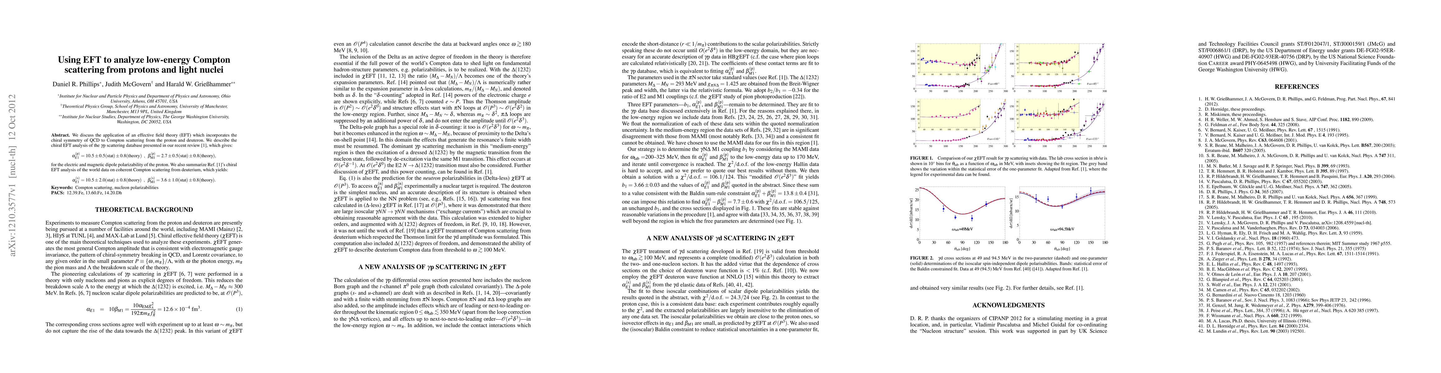 We discuss the application of an effective field theory (EFT) which incorporates the chiral symmetry of QCD to Compton scattering from the proton and deuteron. We describe the chiral EFT analysis of the proton Compton scattering database presented in our recent review (arXiv:1203.6834), which gives: alpha^{(p)}=10.5 +/- 0.5(stat) +/- 0.8(theory); beta^{(p)}= 2.7 +/- 0.5(stat) +/- 0.8(theory), for the electric and magnetic dipole polarizability of the proton. We also summarize the chiral EFT analysis of the world data on coherent Compton scattering from deuterium presented in arXiv:1203.6834. That yields: alpha^{(s)}=10.5 +/- 2.0(stat) +/- 0.8(theory); beta^{(s)}=3.6 +/- 1.0(stat) +/- 0.8(theory).