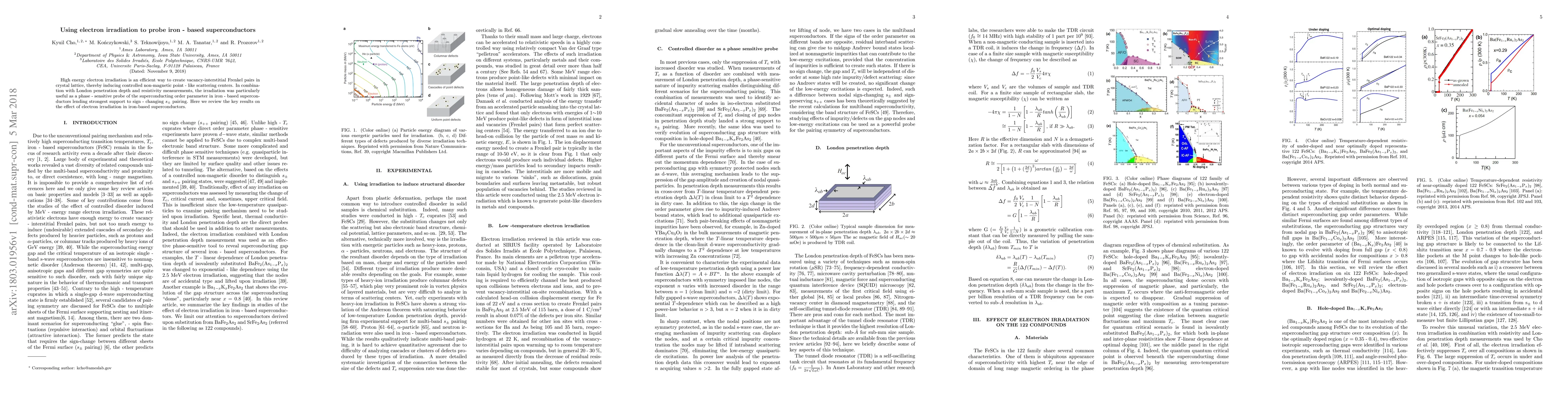 This paper reviews how high-energy electron irradiation creates vacancy-interstitial pairs in iron-based superconductors, providing a phase-sensitive probe that supports sign-changing $s_{\pm}$ pairing through London penetration depth and resistivity measurements.