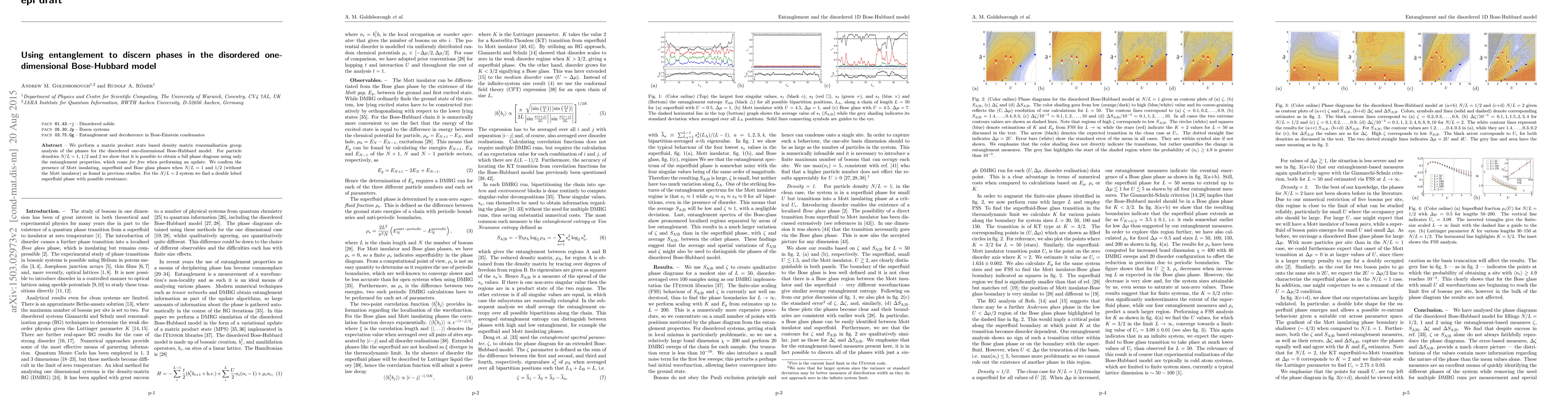 This study uses matrix product state density matrix renormalisation group to analyze the disordered one-dimensional Bose-Hubbard model, revealing phase diagrams based on entanglement properties. It confirms the presence of Mott insulating, superfluid, and Bose glass phases for particle densities N/L = 1 and 1/2, and identifies a double lobed superfluid phase with potential reentrance for N/L = 2.