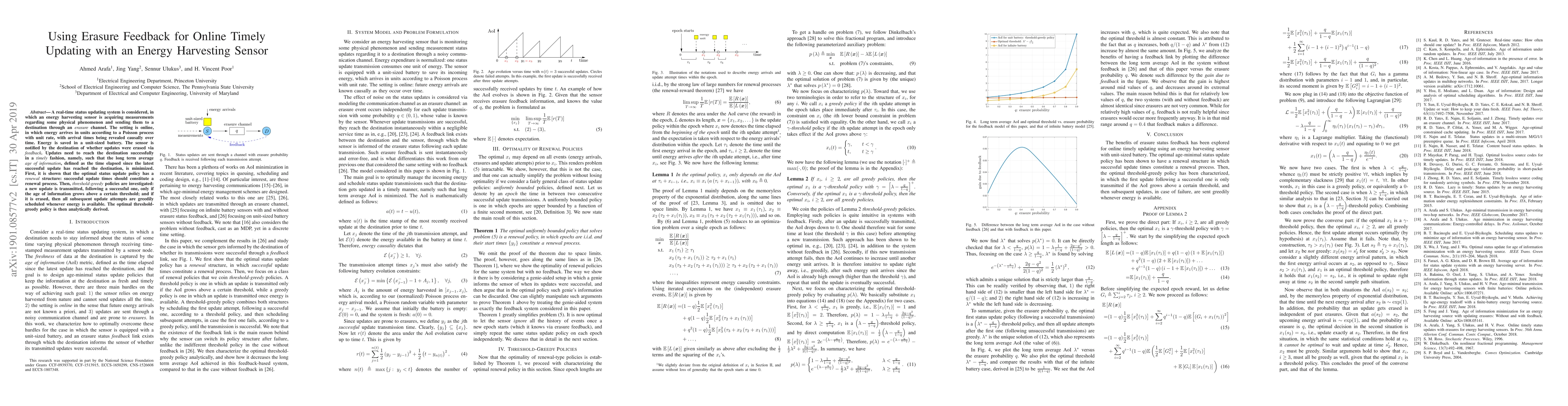 A real-time status updating system is considered, in which an energy harvesting sensor is acquiring measurements regarding some physical phenomenon and sending them to a destination through an erasure channel. The setting is online, in which energy arrives in units according to a Poisson process with unit rate, with arrival times being revealed causally over time. Energy is saved in a unit-sized battery. The sensor is notified by the destination of whether updates were erased via feedback. Updates need to reach the destination successfully in a timely fashion, namely, such that the long term average age of information, defined as the time elapsed since the latest successful update has reached the destination, is minimized. First, it is shown that the optimal status update policy has a renewal structure: successful update times should constitute a renewal process. Then, threshold-greedy policies are investigated: a new update is transmitted, following a successful one, only if the age of information grows above a certain threshold; and if it is erased, then all subsequent update attempts are greedily scheduled whenever energy is available. The optimal threshold-greedy policy is then analytically derived.