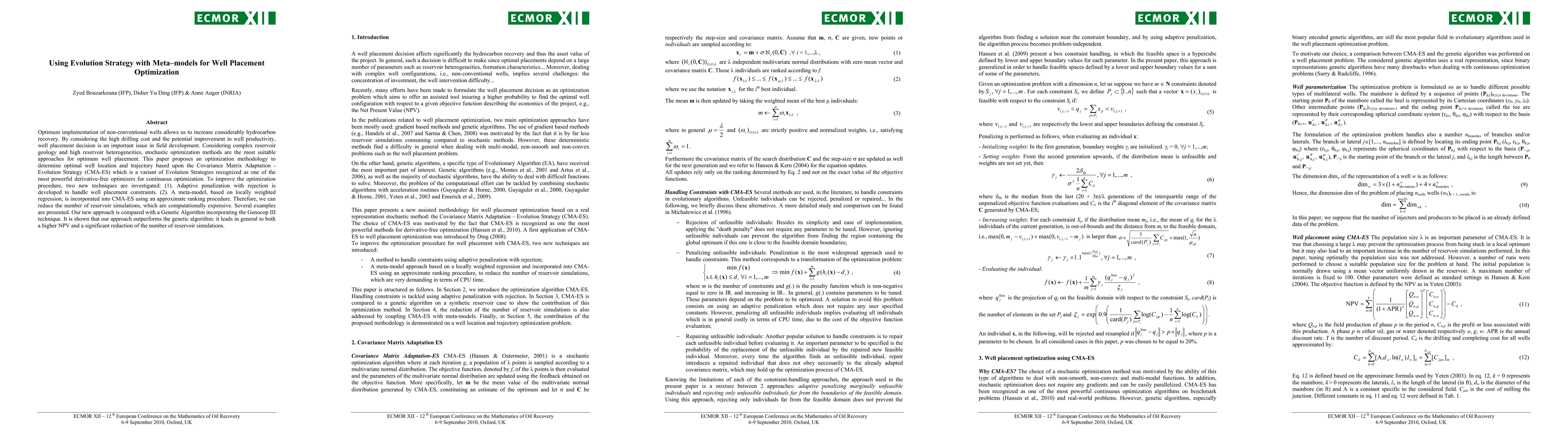 This paper proposes an optimization methodology using Covariance Matrix Adaptation - Evolution Strategy (CMA-ES) to determine optimal well placement in non-conventional wells, incorporating adaptive penalization and a locally weighted regression meta-model to reduce computational costs. The proposed method outperforms a Genetic Algorithm in terms of net present value and simulation efficiency.