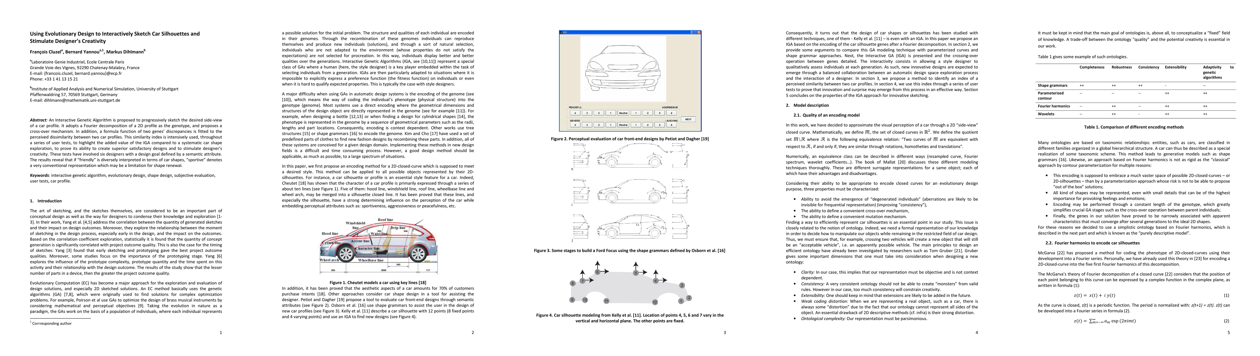 An Interactive Genetic Algorithm is proposed to progressively sketch the desired side-view of a car profile. It adopts a Fourier decomposition of a 2D profile as the genotype, and proposes a cross-over mechanism. In addition, a formula function of two genes' discrepancies is fitted to the perceived dissimilarity between two car profiles. This similarity index is intensively used, throughout a series of user tests, to highlight the added value of the IGA compared to a systematic car shape exploration, to prove its ability to create superior satisfactory designs and to stimulate designer's creativity. These tests have involved six designers with a design goal defined by a semantic attribute. The results reveal that if "friendly" is diversely interpreted in terms of car shapes, "sportive" denotes a very conventional representation which may be a limitation for shape renewal.