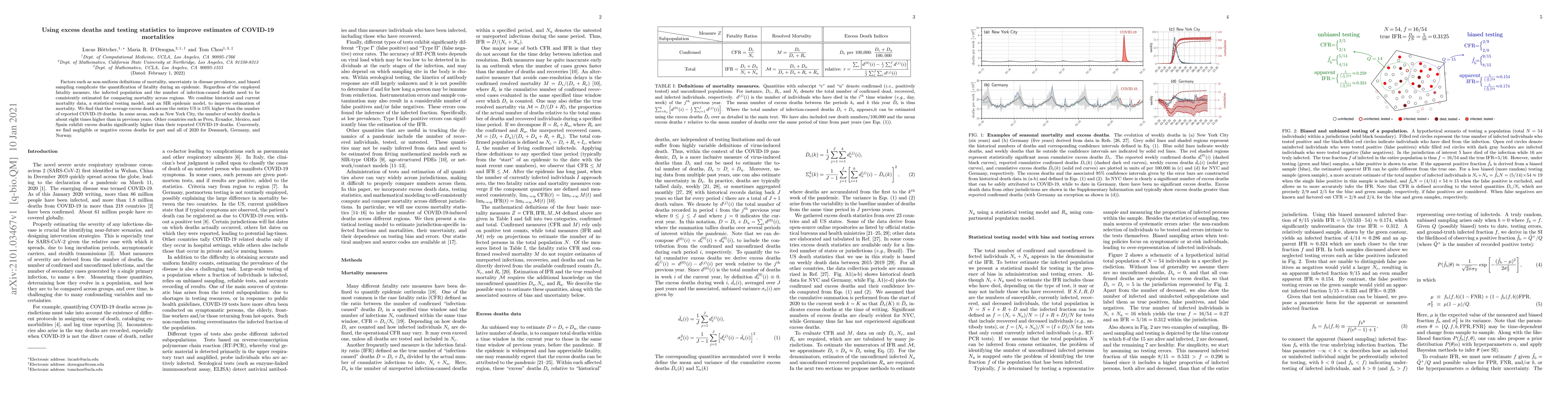 Factors such as non-uniform definitions of mortality, uncertainty in disease prevalence, and biased sampling complicate the quantification of fatality during an epidemic. Regardless of the employed fatality measure, the infected population and the number of infection-caused deaths need to be consistently estimated for comparing mortality across regions. We combine historical and current mortality data, a statistical testing model, and an SIR epidemic model, to improve estimation of mortality. We find that the average excess death across the entire US is 13$\%$ higher than the number of reported COVID-19 deaths. In some areas, such as New York City, the number of weekly deaths is about eight times higher than in previous years. Other countries such as Peru, Ecuador, Mexico, and Spain exhibit excess deaths significantly higher than their reported COVID-19 deaths. Conversely, we find negligible or negative excess deaths for part and all of 2020 for Denmark, Germany, and Norway.