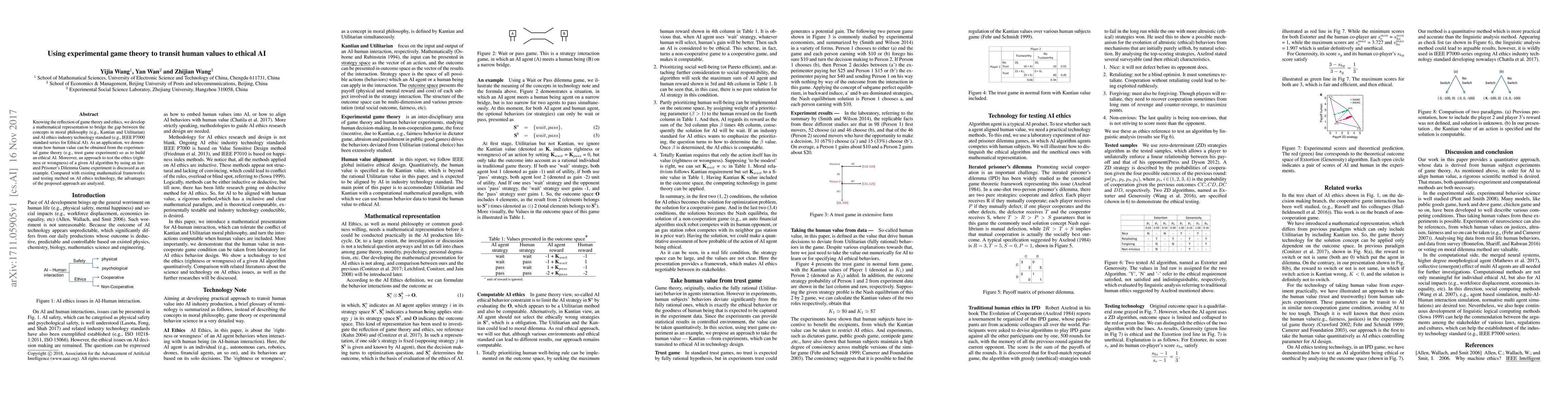 This paper proposes a mathematical framework using experimental game theory to translate human moral values into ethical AI standards, exemplified by trust game experiments. It also introduces an iterated Prisoner's Dilemma method to test AI algorithms' ethical correctness, demonstrating advantages over existing frameworks.