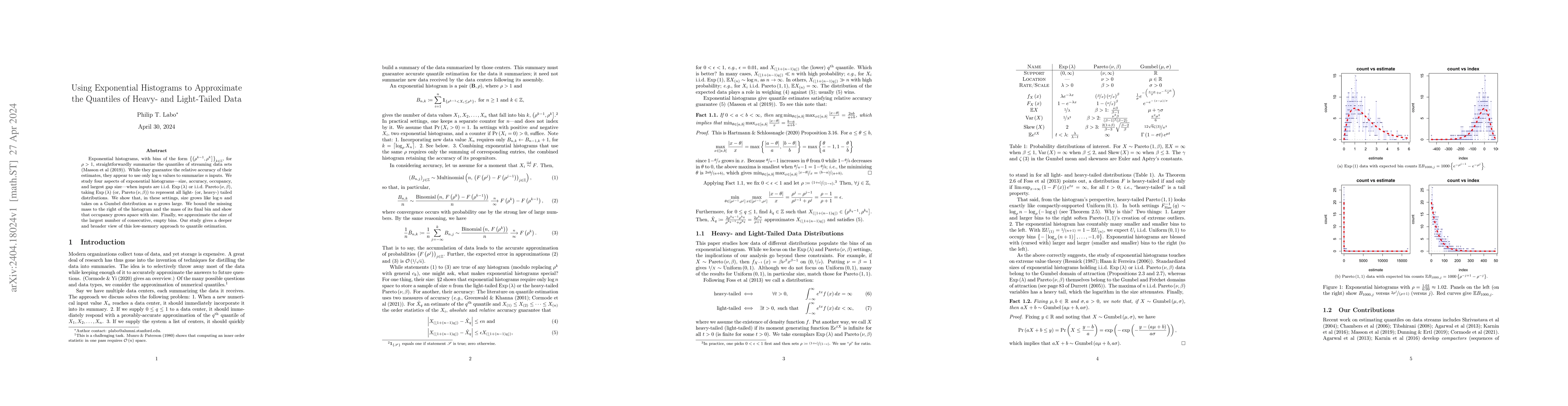 This paper investigates the properties of exponential histograms for approximating quantiles in heavy- and light-tailed data distributions. It finds that exponential histograms maintain a size that grows logarithmically with the number of inputs and occupies a Gumbel distribution as the input size increases, offering a low-memory approach to quantile estimation.
