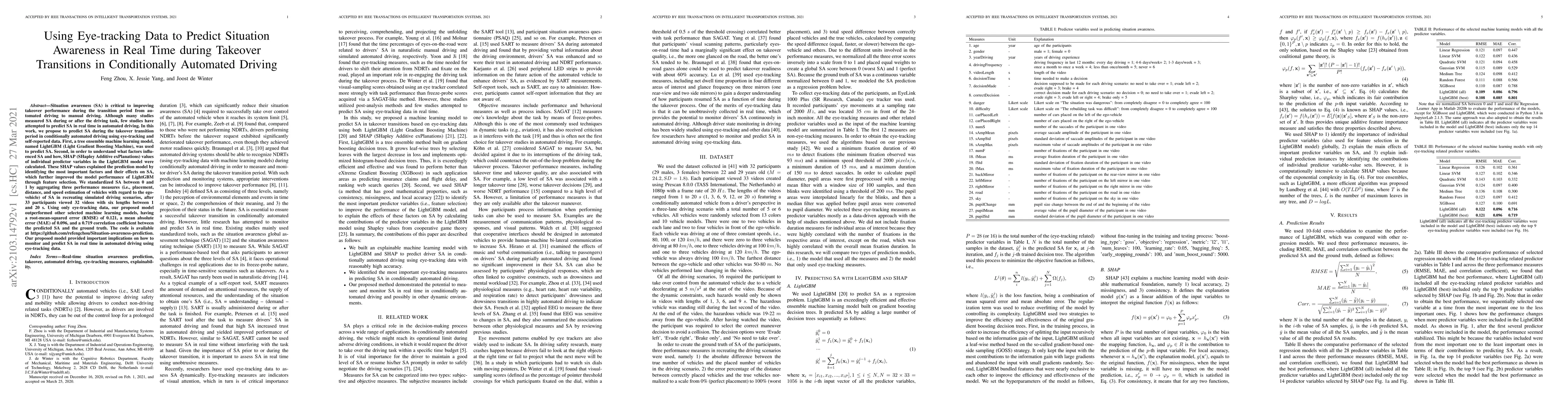 This research proposes a real-time prediction model for situation awareness (SA) during automated driving takeover transitions using eye-tracking data and a LightGBM machine learning model. The model, enhanced by SHAP values for feature selection, outperformed other models, indicating its potential for real-time SA monitoring in conditionally automated driving.