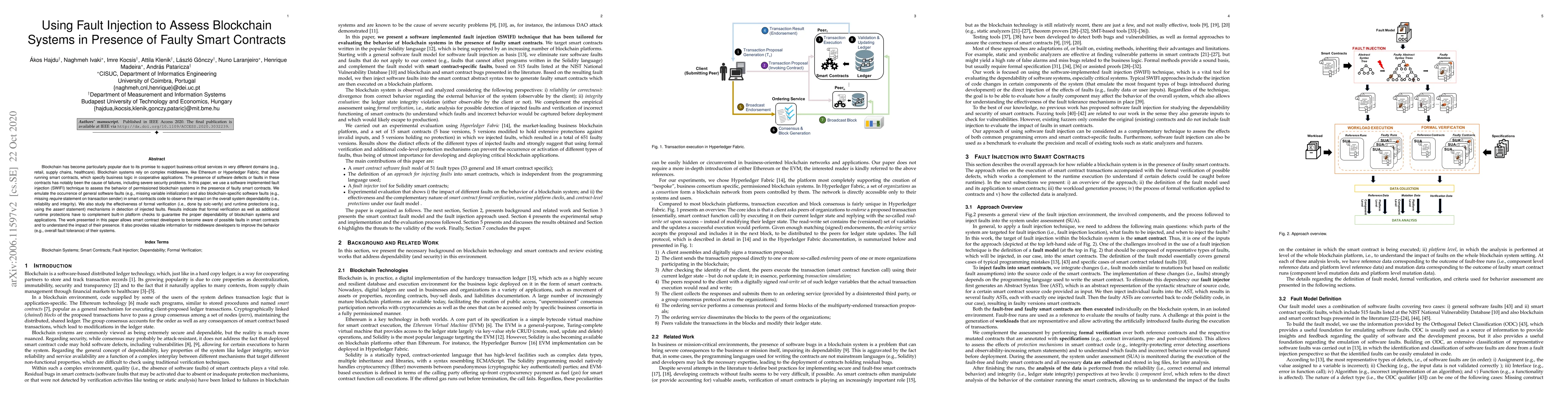 Blockchain has become particularly popular due to its promise to support business-critical services in very different domains (e.g., retail, supply chains, healthcare). Blockchain systems rely on complex middleware, like Ethereum or Hyperledger Fabric, that allow running smart contracts, which specify business logic in cooperative applications. The presence of software defects or faults in these contracts has notably been the cause of failures, including severe security problems. In this paper, we use a software implemented fault injection (SWIFI) technique to assess the behavior of permissioned blockchain systems in the presence of faulty smart contracts. We emulate the occurrence of general software faults (e.g., missing variable initialization) and also blockchain-specific software faults (e.g., missing require statement on transaction sender) in smart contracts code to observe the impact on the overall system dependability (i.e., reliability and integrity). We also study the effectiveness of formal verification (i.e., done by solc-verify) and runtime protections (e.g., using the assert statement) mechanisms in detection of injected faults. Results indicate that formal verification as well as additional runtime protections have to complement built-in platform checks to guarantee the proper dependability of blockchain systems and applications. The work presented in this paper allows smart contract developers to become aware of possible faults in smart contracts and to understand the impact of their presence. It also provides valuable information for middleware developers to improve the behavior (e.g., overall fault tolerance) of their systems.