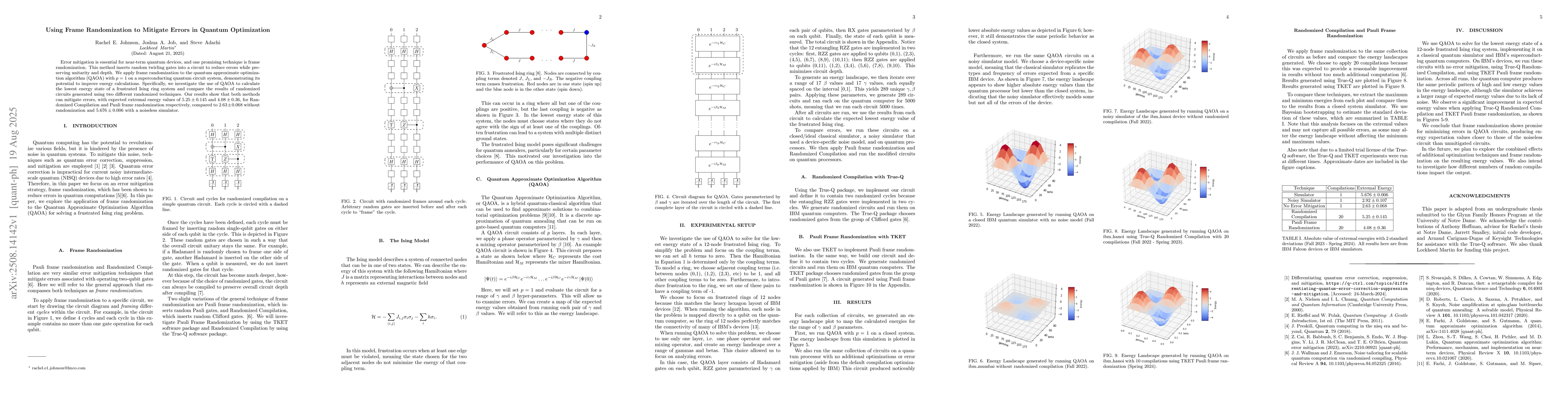 Error mitigation is essential for near-term quantum devices, and one promising technique is frame randomization. This method inserts random twirling gates into a circuit to reduce errors while preserving unitarity and depth. We apply frame randomization to the quantum approximate optimization algorithm (QAOA) with $p=1$ on a superconducting quantum circuit system, demonstrating its potential to improve energy calculations. Specifically, we investigate the use of QAOA to calculate the lowest energy state of a frustrated Ising ring system and compare the results of randomized circuits generated using two different randomized techniques. Our results show that both methods can mitigate errors, with expected extremal energy values of $5.25\pm0.145$ and $4.08\pm0.36$, for Randomized Compilation and Pauli frame randomization respectively, compared to $2.63\pm0.068$ without randomization and $5.676\pm0.006$ with a noiseless simulator.