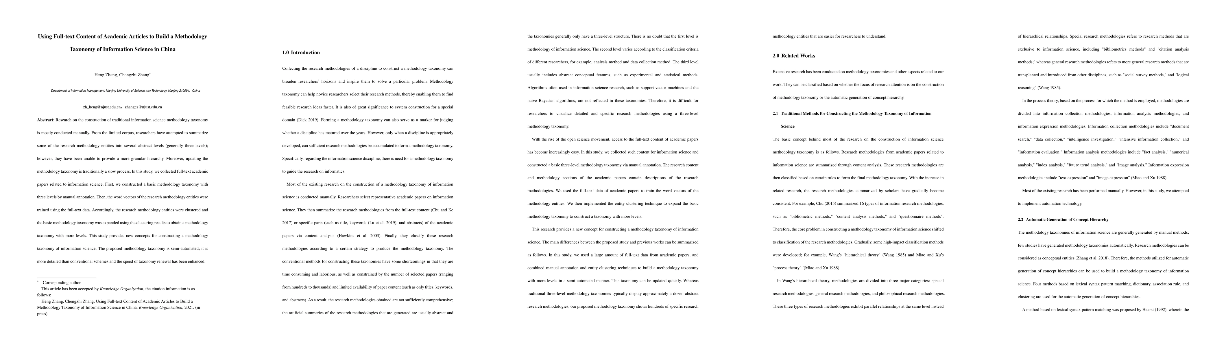 Research on the construction of traditional information science methodology taxonomy is mostly conducted manually. From the limited corpus, researchers have attempted to summarize some of the research methodology entities into several abstract levels (generally three levels); however, they have been unable to provide a more granular hierarchy. Moreover, updating the methodology taxonomy is traditionally a slow process. In this study, we collected full-text academic papers related to information science. First, we constructed a basic methodology taxonomy with three levels by manual annotation. Then, the word vectors of the research methodology entities were trained using the full-text data. Accordingly, the research methodology entities were clustered and the basic methodology taxonomy was expanded using the clustering results to obtain a methodology taxonomy with more levels. This study provides new concepts for constructing a methodology taxonomy of information science. The proposed methodology taxonomy is semi-automated; it is more detailed than conventional schemes and the speed of taxonomy renewal has been enhanced.