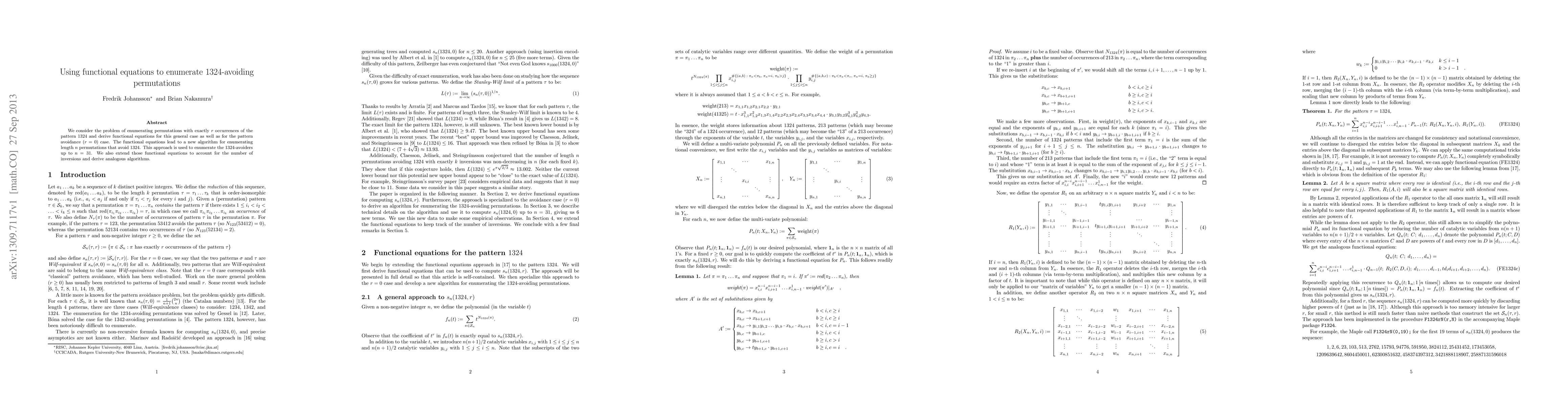Researchers developed functional equations to count permutations with exactly r occurrences of the 1324 pattern, enabling a new algorithm for enumerating length n permutations that avoid this pattern up to n=31.