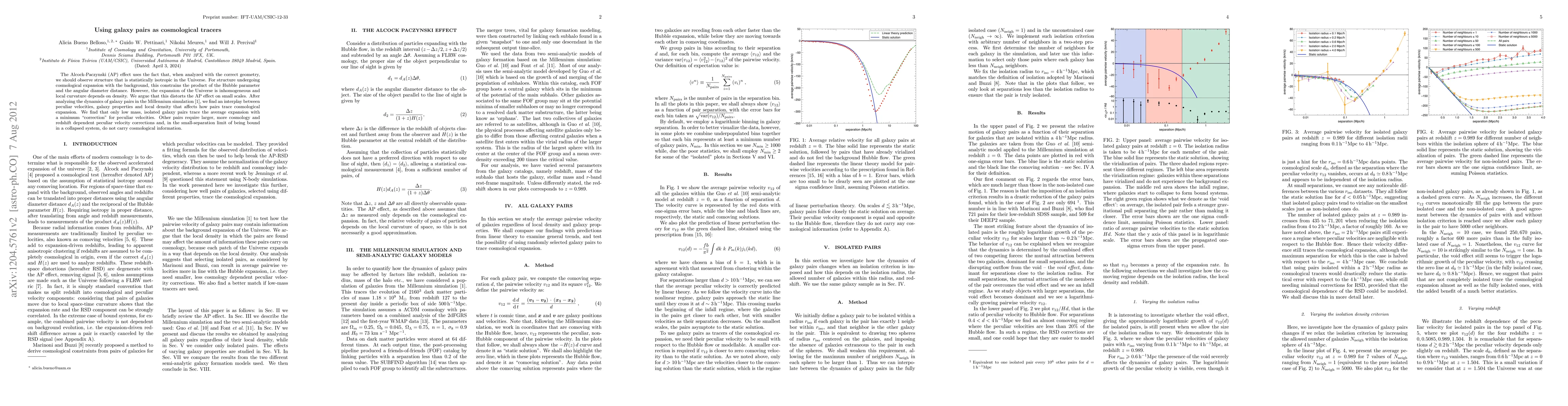 The Alcock-Paczynski (AP) effect uses the fact that, when analyzed with the correct geometry, we should observe structure that is statistically isotropic in the Universe. For structure undergoing cosmological expansion with the background, this constrains the product of the Hubble parameter and the angular diameter distance. However, the expansion of the Universe is inhomogeneous and local curvature depends on density. We argue that this distorts the AP effect on small scales. After analyzing the dynamics of galaxy pairs in the Millennium simulation, we find an interplay between peculiar velocities, galaxy properties and local density that affects how pairs trace cosmological expansion. We find that only low mass, isolated galaxy pairs trace the average expansion with a minimum "correction" for peculiar velocities. Other pairs require larger, more cosmology and redshift dependent peculiar velocity corrections and, in the small-separation limit of being bound in a collapsed system, do not carry cosmological information.