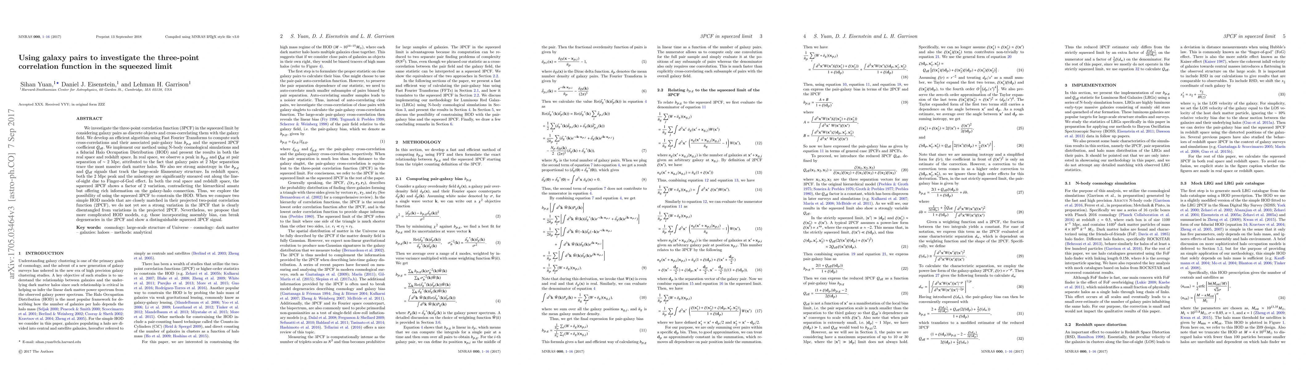 This paper investigates the three-point correlation function (3PCF) in the squeezed limit using galaxy pairs, revealing a peak in cross-correlations at ~2 Mpc linked to massive dark matter halos. The study shows anisotropy in real space and significant smearing in redshift space due to the Finger-of-God effect.