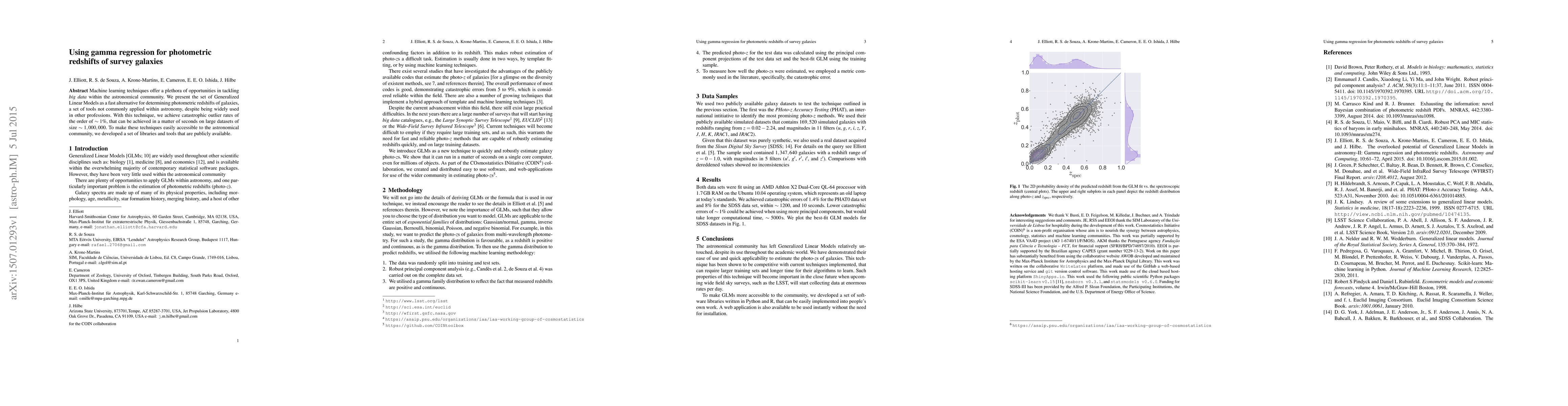 This paper introduces Generalized Linear Models, specifically gamma regression, as a rapid alternative for estimating photometric redshifts of galaxies, achieving ~1% outlier rates on large datasets. The authors developed accessible libraries to facilitate adoption in astronomy.