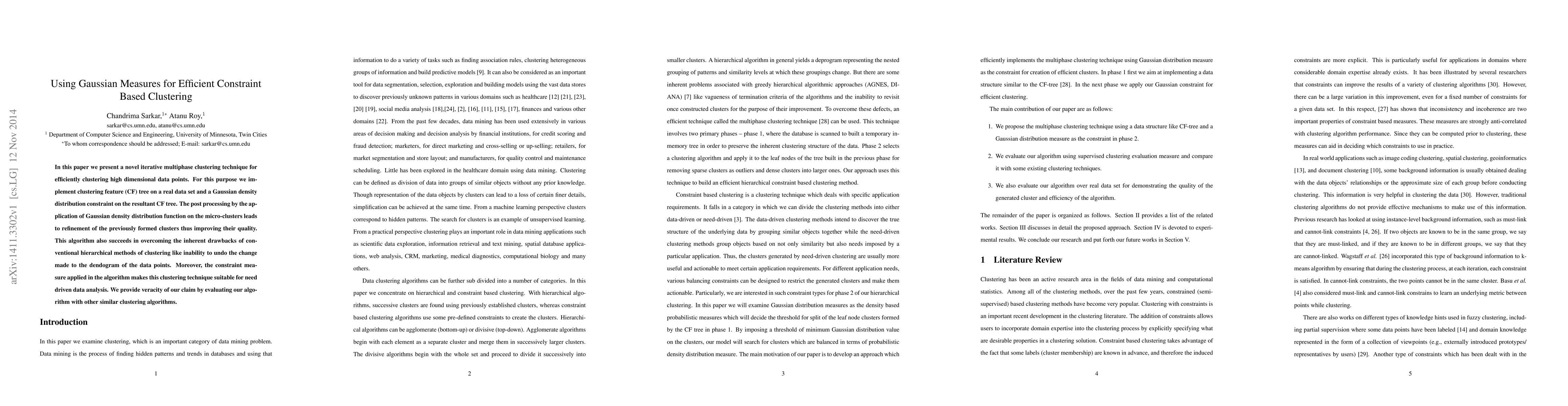 In this paper we present a novel iterative multiphase clustering technique for efficiently clustering high dimensional data points. For this purpose we implement clustering feature (CF) tree on a real data set and a Gaussian density distribution constraint on the resultant CF tree. The post processing by the application of Gaussian density distribution function on the micro-clusters leads to refinement of the previously formed clusters thus improving their quality. This algorithm also succeeds in overcoming the inherent drawbacks of conventional hierarchical methods of clustering like inability to undo the change made to the dendogram of the data points. Moreover, the constraint measure applied in the algorithm makes this clustering technique suitable for need driven data analysis. We provide veracity of our claim by evaluating our algorithm with other similar clustering algorithms. Introduction