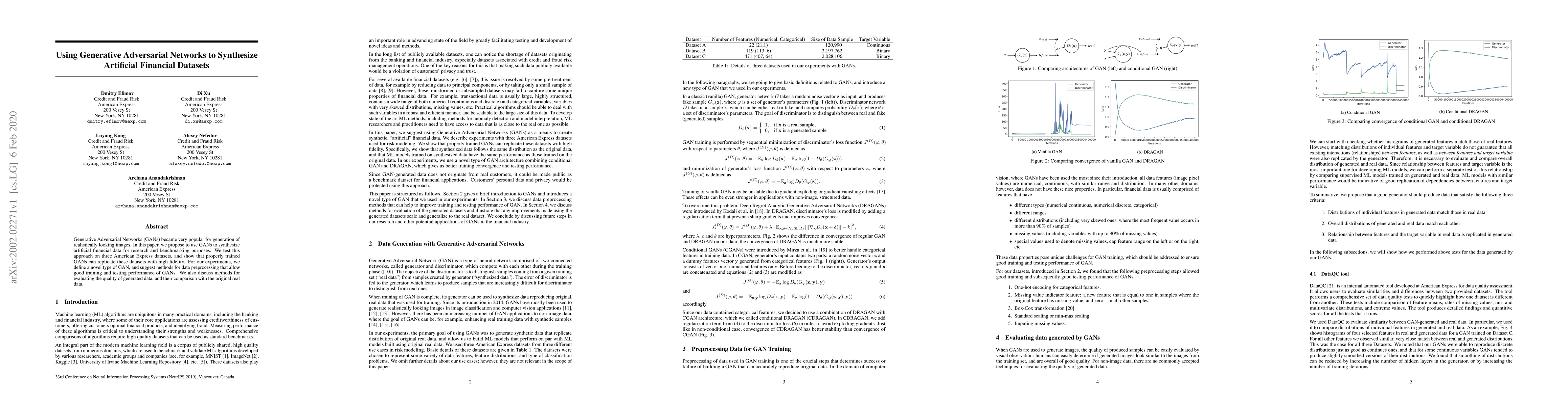 This paper proposes using Generative Adversarial Networks (GANs) to create realistic artificial financial datasets for research and benchmarking. The authors develop a novel GAN type and provide methods for data preprocessing, demonstrating high fidelity replication of American Express datasets.