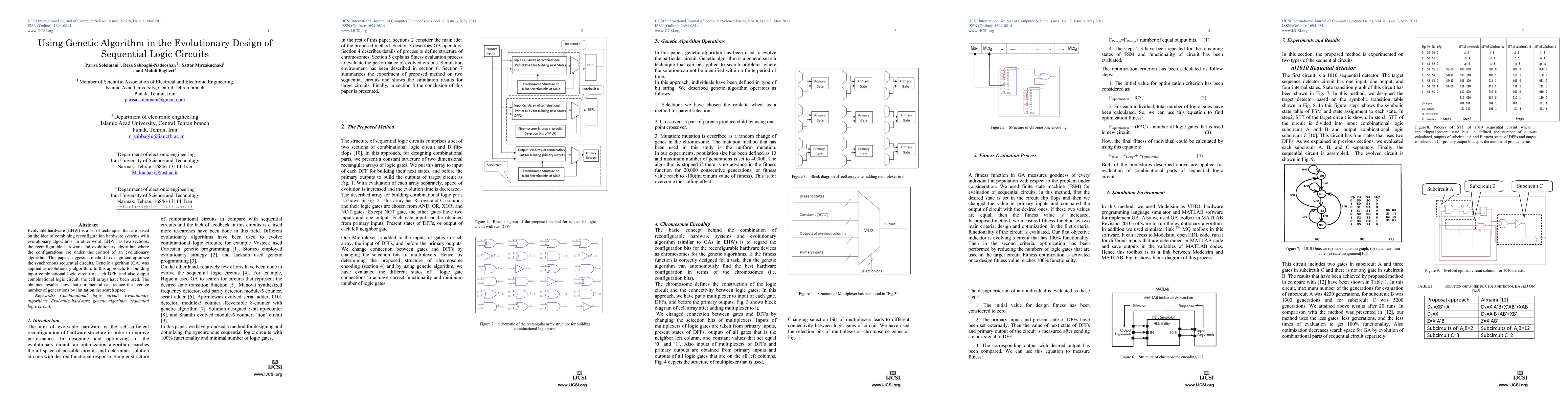 This research utilizes a genetic algorithm within evolvable hardware to design and optimize synchronous sequential logic circuits. The method employs cell arrays to construct input and output combinational logic, demonstrating reduced average generations by limiting the search space.