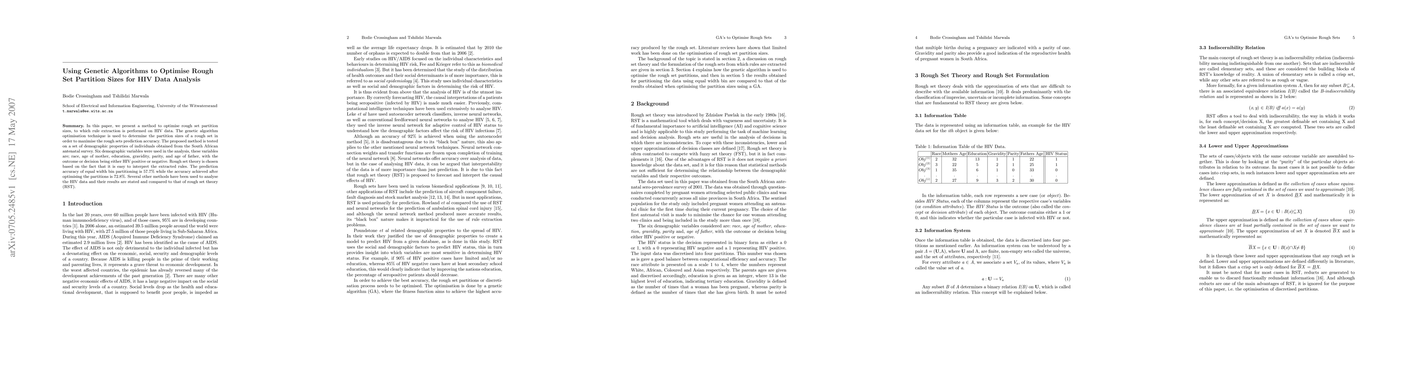 This paper optimises rough set partition sizes using genetic algorithms to improve the prediction accuracy of HIV data analysis. The method achieves a significant increase in prediction accuracy from 57.7% to 72.8% by fine-tuning the partition sizes, demonstrating the effectiveness of the proposed approach.