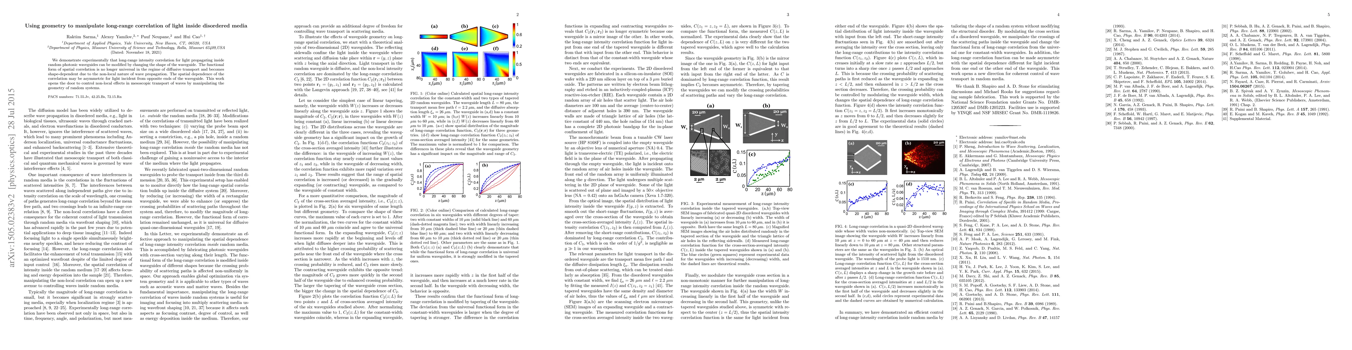 This research experimentally shows that altering the geometry of random photonic waveguides can modify long-range intensity correlations of light, demonstrating that the spatial correlation becomes shape-dependent and can be asymmetric depending on the light's entry point. This finding enables control over non-local wave transport effects in disordered media.