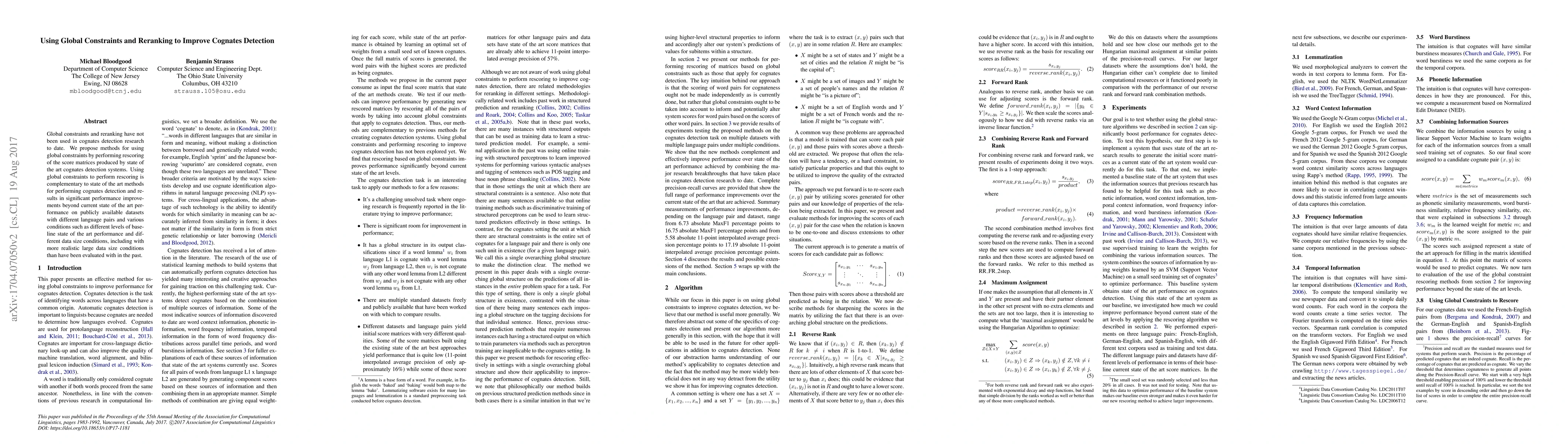 Global constraints and reranking have not been used in cognates detection research to date. We propose methods for using global constraints by performing rescoring of the score matrices produced by state of the art cognates detection systems. Using global constraints to perform rescoring is complementary to state of the art methods for performing cognates detection and results in significant performance improvements beyond current state of the art performance on publicly available datasets with different language pairs and various conditions such as different levels of baseline state of the art performance and different data size conditions, including with more realistic large data size conditions than have been evaluated with in the past.