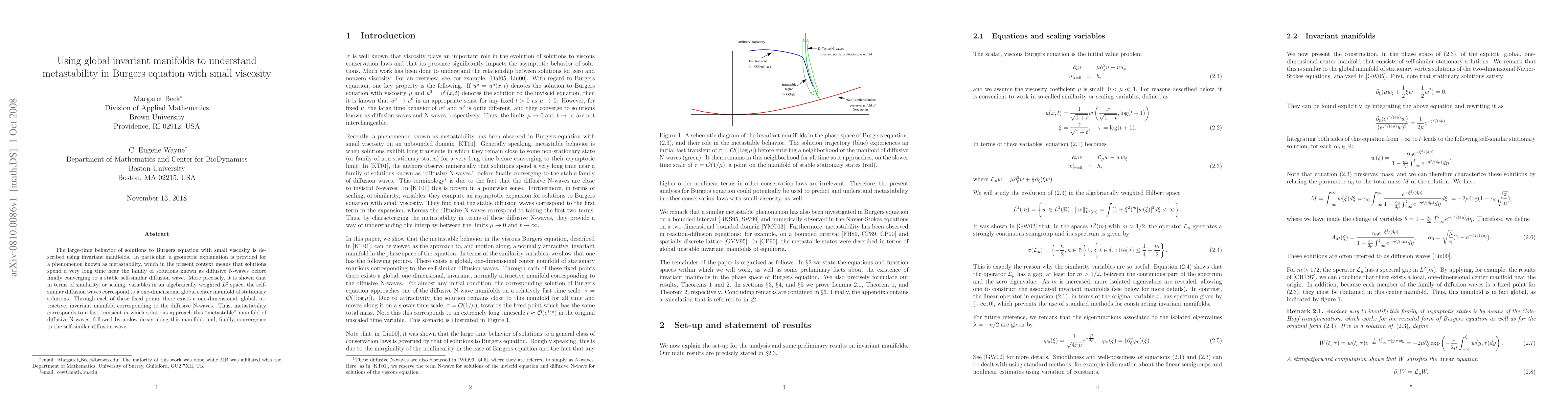 This paper uses global invariant manifolds to explain the metastability phenomenon in the Burgers equation with small viscosity, showing that solutions linger near diffusive N-waves before slowly converging to a stable self-similar diffusion wave. The study reveals a one-dimensional global center manifold corresponding to the self-similar diffusion waves and an attractive invariant manifold for the diffusive N-waves.