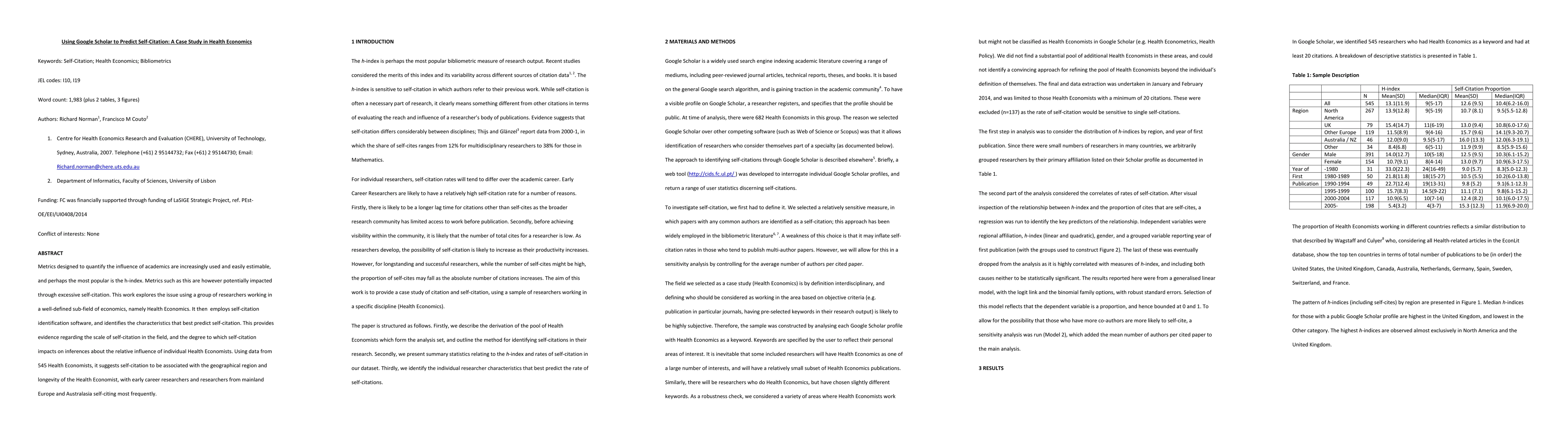 This study uses Google Scholar data to investigate self-citation in Health Economics, finding that geographical region and longevity of researchers are associated with self-citation, particularly among early career researchers from mainland Europe and Australasia.