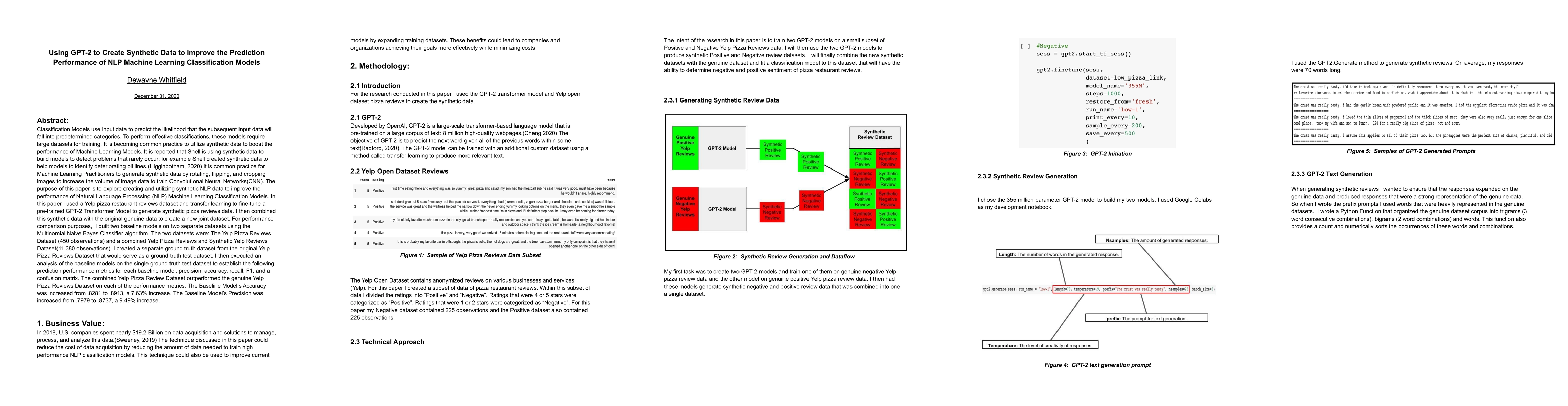 Classification Models use input data to predict the likelihood that the subsequent input data will fall into predetermined categories. To perform effective classifications, these models require large datasets for training. It is becoming common practice to utilize synthetic data to boost the performance of Machine Learning Models. It is reported that Shell is using synthetic data to build models to detect problems that rarely occur; for example Shell created synthetic data to help models to identify deteriorating oil lines. It is common practice for Machine Learning Practitioners to generate synthetic data by rotating, flipping, and cropping images to increase the volume of image data to train Convolutional Neural Networks. The purpose of this paper is to explore creating and utilizing synthetic NLP data to improve the performance of Natural Language Processing Machine Learning Classification Models. In this paper I used a Yelp pizza restaurant reviews dataset and transfer learning to fine-tune a pre-trained GPT-2 Transformer Model to generate synthetic pizza reviews data. I then combined this synthetic data with the original genuine data to create a new joint dataset. The new combined model significantly outperformed the original model in accuracy and precision.