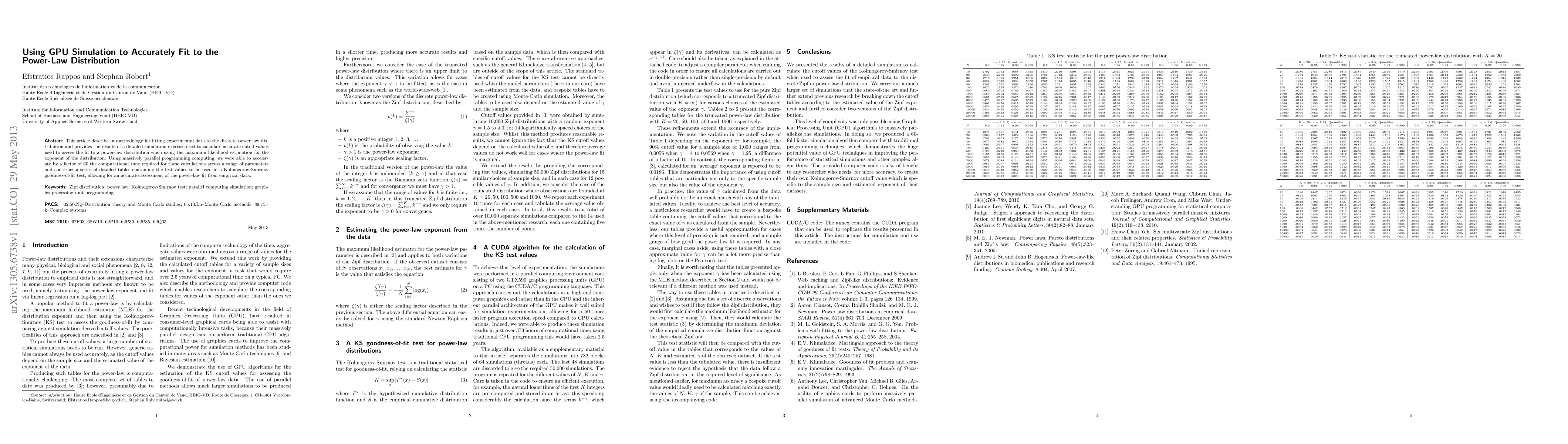 This article describes a methodology for fitting experimental data to the discrete power-law distribution and provides the results of a detailed simulation exercise used to calculate accurate cutoff values used to assess the fit to a power-law distribution when using the maximum likelihood estimation for the exponent of the distribution. Using massively parallel programming computing, we were able to accelerate by a factor of 60 the computational time required for these calculations across a range of parameters and construct a series of detailed tables containing the test values to be used in a Kolmogorov-Smirnov goodness-of-fit test, allowing for an accurate assessment of the power-law fit from empirical data.