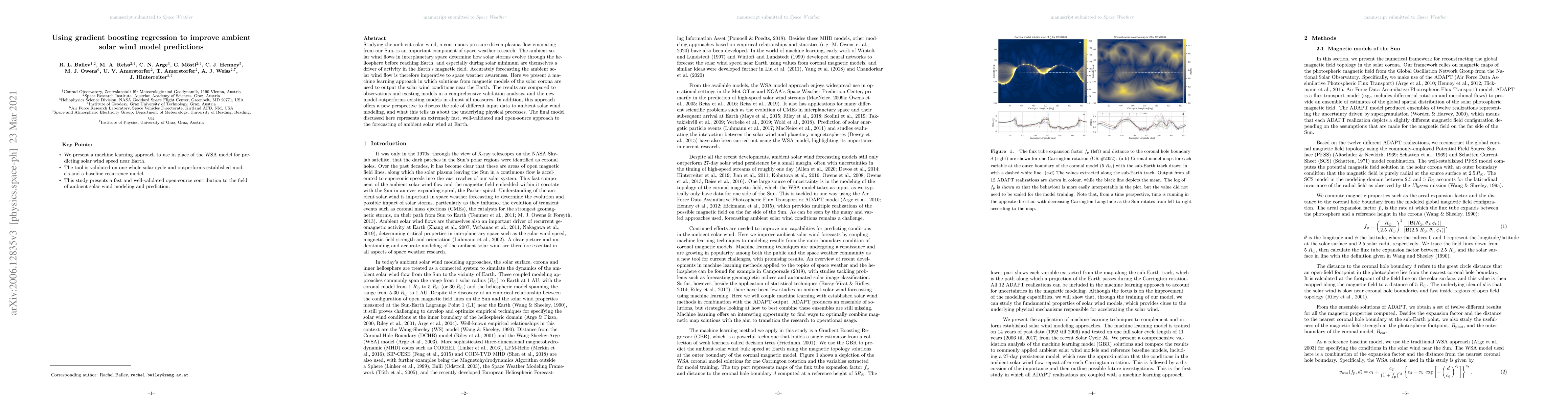 This paper employs gradient boosting regression to enhance predictions of ambient solar wind conditions, leveraging magnetic model outputs. The new machine learning model outperforms existing models, offering a faster, validated, and open-source forecasting method for space weather awareness.