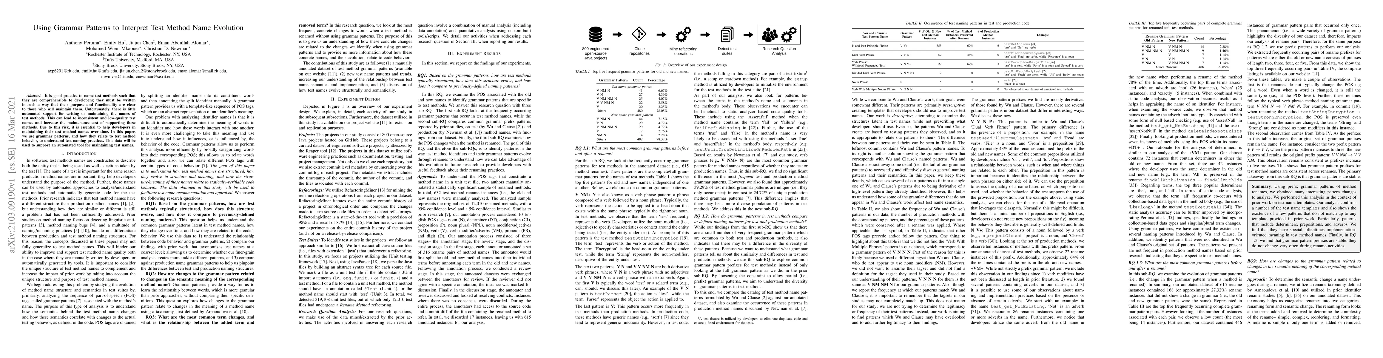 It is good practice to name test methods such that they are comprehensible to developers; they must be written in such a way that their purpose and functionality are clear to those who will maintain them. Unfortunately, there is little automated support for writing or maintaining the names of test methods. This can lead to inconsistent and low-quality test names and increase the maintenance cost of supporting these methods. Due to this risk, it is essential to help developers in maintaining their test method names over time. In this paper, we use grammar patterns, and how they relate to test method behavior, to understand test naming practices. This data will be used to support an automated tool for maintaining test names.