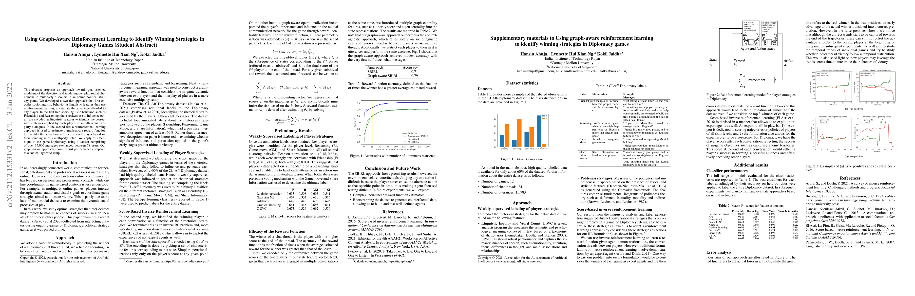 This abstract proposes an approach towards goal-oriented modeling of the detection and modeling complex social phenomena in multiparty discourse in an online political strategy game. We developed a two-tier approach that first encodes sociolinguistic behavior as linguistic features then use reinforcement learning to estimate the advantage afforded to any player. In the first tier, sociolinguistic behavior, such as Friendship and Reasoning, that speakers use to influence others are encoded as linguistic features to identify the persuasive strategies applied by each player in simultaneous two-party dialogues. In the second tier, a reinforcement learning approach is used to estimate a graph-aware reward function to quantify the advantage afforded to each player based on their standing in this multiparty setup. We apply this technique to the game Diplomacy, using a dataset comprising of over 15,000 messages exchanged between 78 users. Our graph-aware approach shows robust performance compared to a context-agnostic setup.