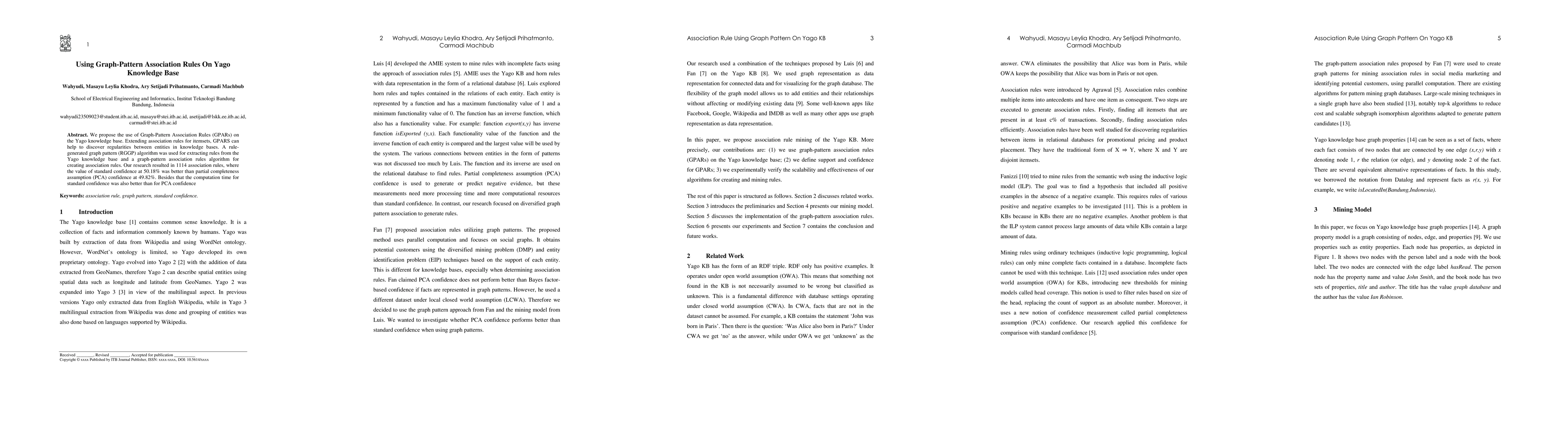 This paper proposes the use of Graph-Pattern Association Rules (GPARS) on the Yago knowledge base to identify regularities between entities. The study developed a rule-generated graph pattern (RGGP) algorithm and found 1114 association rules, showing that standard confidence at 50.18% outperformed partial completeness assumption (PCA) confidence at 49.82%, with better computation time.