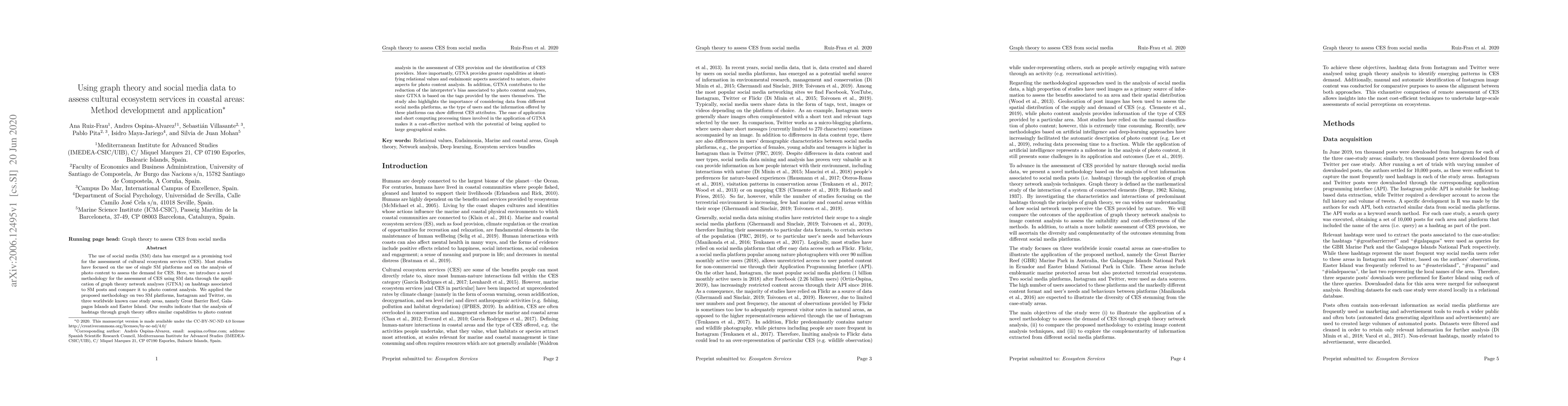 The use of social media (SM) data has emerged as a promising tool for the assessment of cultural ecosystem services (CES). Most studies have focused on the use of single SM platforms and on the analysis of photo content to assess the demand for CES. Here, we introduce a novel methodology for the assessment of CES using SM data through the application of graph theory network analyses (GTNA) on hashtags associated to SM posts and compare it to photo content analysis. We applied the proposed methodology on two SM platforms, Instagram and Twitter, on three worldwide known case study areas, namely Great Barrier Reef, Galapagos Islands and Easter Island. Our results indicate that the analysis of hashtags through graph theory offers similar capabilities to photo content analysis in the assessment of CES provision and the identification of CES providers. More importantly, GTNA provides greater capabilities at identifying relational values and eudaimonic aspects associated to nature, elusive aspects for photo content analysis. In addition, GTNA contributes to the reduction of the interpreter's bias associated to photo content analyses, since GTNA is based on the tags provided by the users themselves. The study also highlights the importance of considering data from different social media platforms, as the type of users and the information offered by these platforms can show different CES attributes. The ease of application and short computing processing times involved in the application of GTNA makes it a cost-effective method with the potential of being applied to large geographical scales.