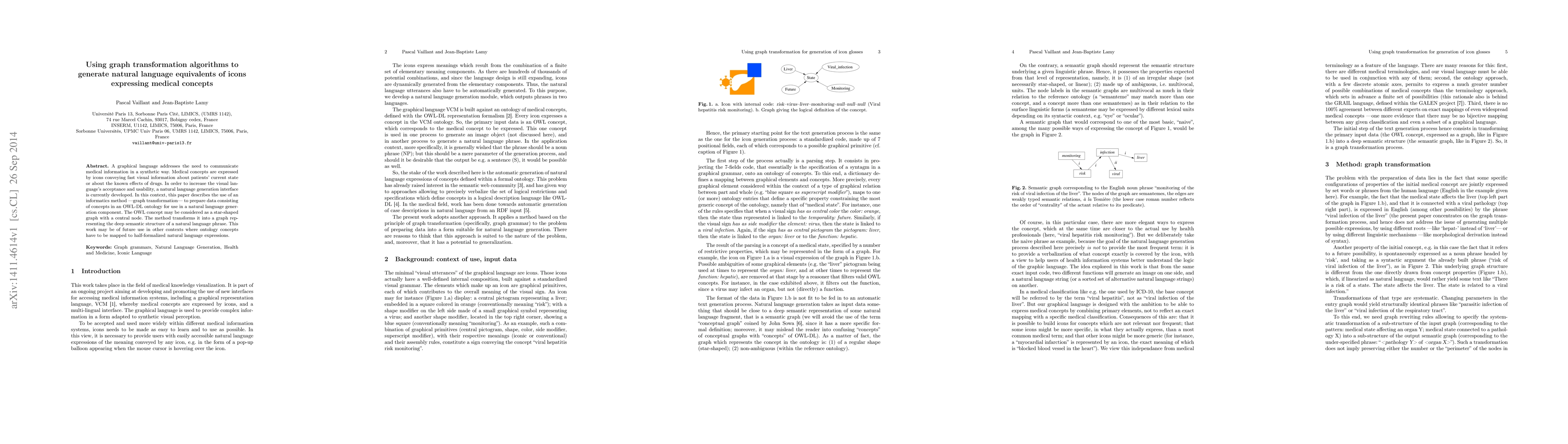 This paper explores using graph transformation algorithms to convert medical icons into natural language phrases, enhancing the usability of a graphical language for medical information. The method transforms OWL-DL ontology concepts into graphs that represent the semantic structure of natural language, potentially aiding in broader applications where ontology concepts are mapped to informal language.
