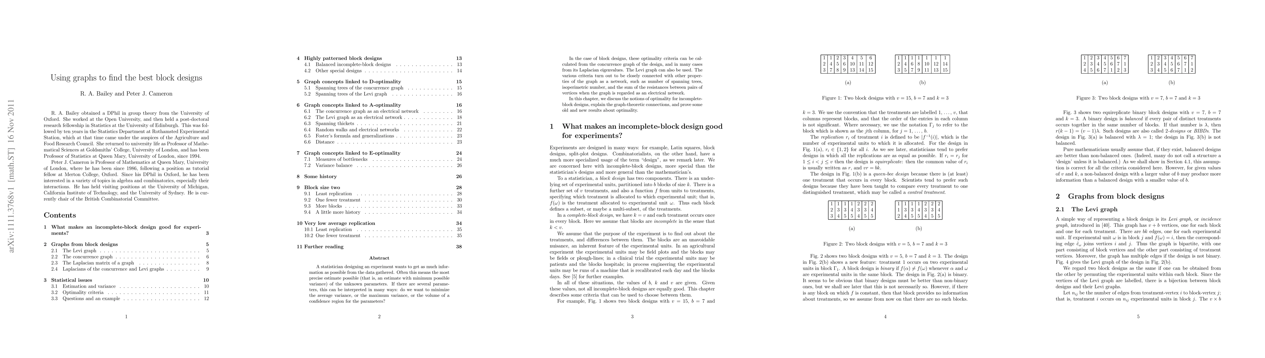 This paper uses graph theory to optimize block designs in experiments, exploring connections between design parameters and network properties like spanning trees and resistances. It proves new results about optimality in incomplete-block designs using Levi graphs and Laplacian eigenvalues.