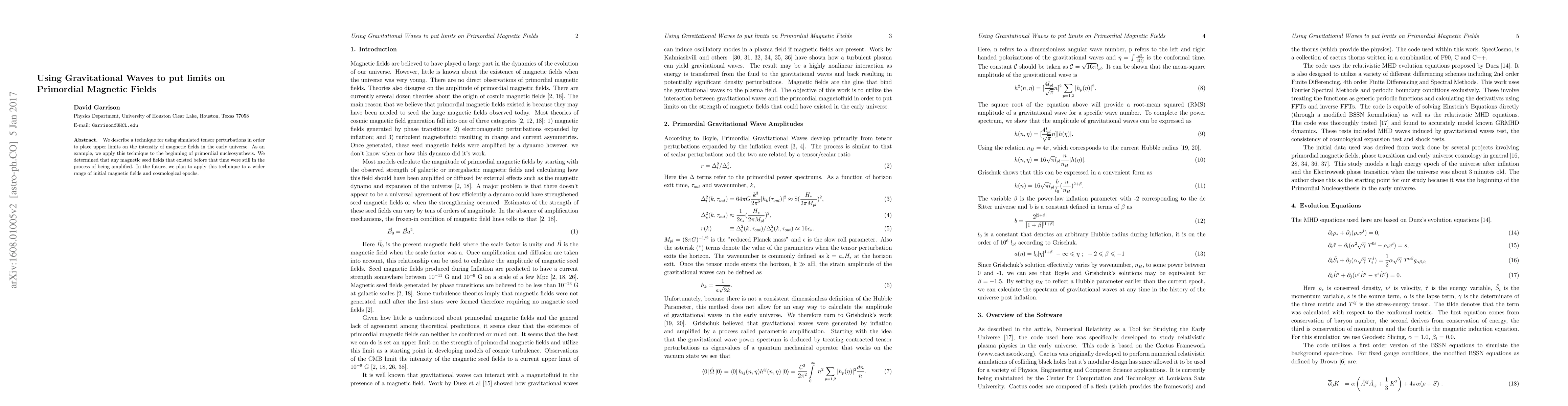 We describe a technique for using simulated tensor perturbations in order to place upper limits on the intensity of magnetic fields in the early universe. As an example, we apply this technique to the beginning of primordial nucleosynthesis. We determined that any magnetic seed fields that existed before that time were still in the process of being amplified. In the future, we plan to apply this technique to a wider range of initial magnetic fields and cosmological epochs.