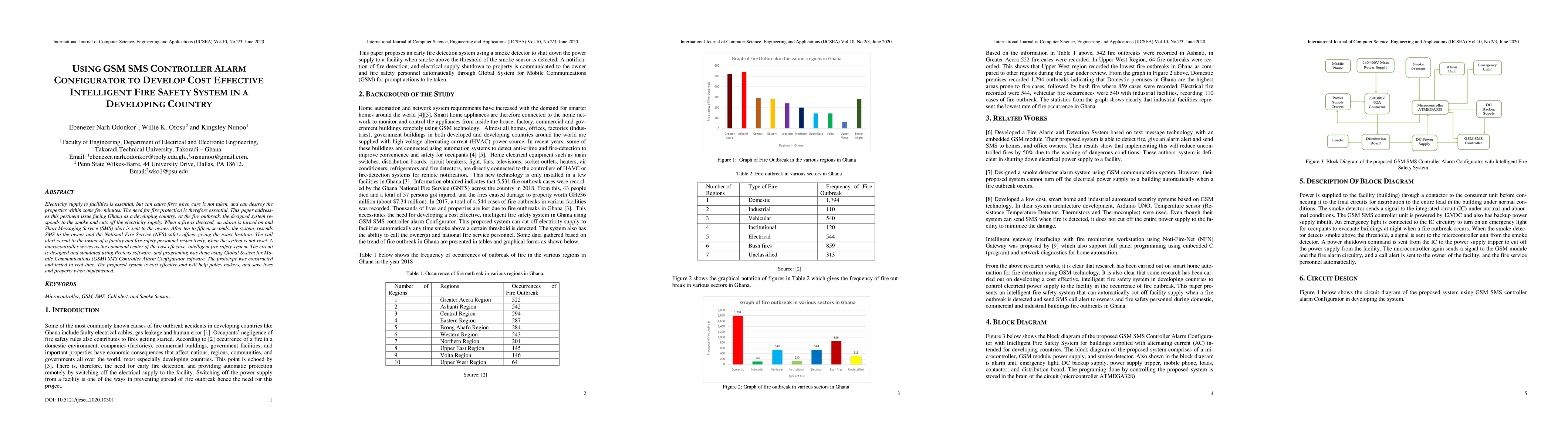 Electricity supply to facilities is essential, but can cause fires when care is not taken, and can destroy the properties within some few minutes. The need for fire protection is therefore essential. This paper address-es this pertinent issue facing Ghana as a developing country. At the fire outbreak, the designed system re-sponds to the smoke and cuts off the electricity supply. When a fire is detected, an alarm is turned on and Short Messaging Service (SMS) alert is sent to the owner. After ten to fifteen seconds, the system, resends SMS to the owner and the National Fire Service (NFS) safety officer giving the exact location. The call alert is sent to the owner of a facility and fire safety personnel respectively, when the system is not reset. A microcontroller serves as the command center of the cost effective, intelligent fire safety system. The circuit is designed and simulated using Proteus software, and programing was done using Global System for Mo-bile Communications (GSM) SMS Controller Alarm Configurator software. The prototype was constructed and tested in real-time. The proposed system is cost effective and will help policy makers, and save lives and property when implemented.