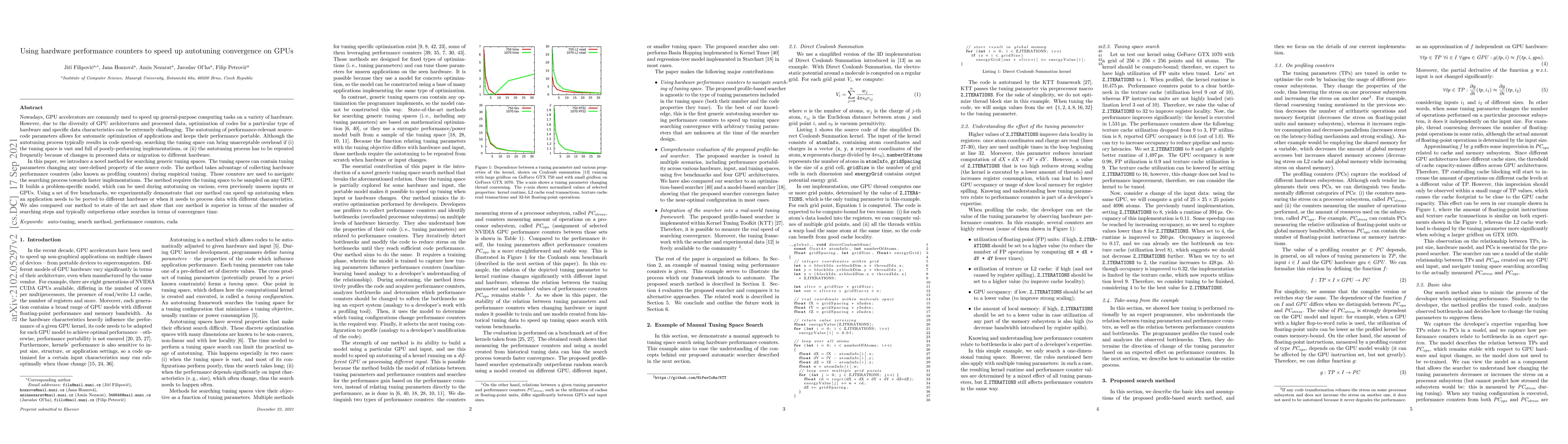 This paper proposes a novel method to speed up autotuning convergence on GPUs by leveraging hardware performance counters to guide the search for optimal code parameters. The method builds a problem-specific model from profiling counters, which accelerates the autotuning process for different hardware or data characteristics, outperforming state-of-the-art methods in convergence speed.