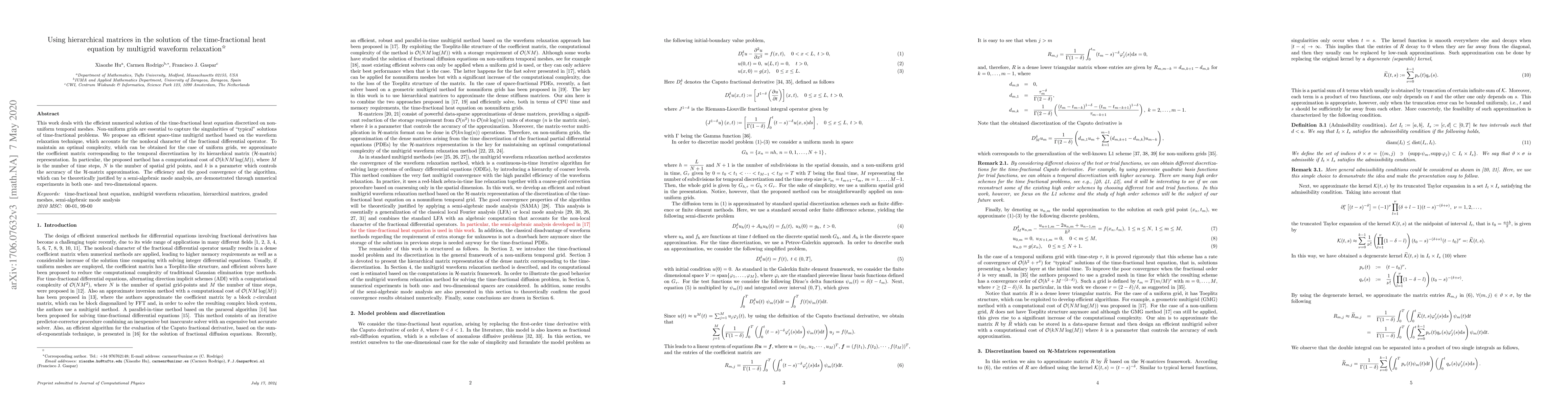 This work deals with the efficient numerical solution of the time-fractional heat equation discretized on non-uniform temporal meshes. Non-uniform grids are essential to capture the singularities of "typical" solutions of time-fractional problems. We propose an efficient space-time multigrid method based on the waveform relaxation technique, which accounts for the nonlocal character of the fractional differential operator. To maintain an optimal complexity, which can be obtained for the case of uniform grids, we approximate the coefficient matrix corresponding to the temporal discretization by its hierarchical matrix (${\cal H}$-matrix) representation. In particular, the proposed method has a computational cost of ${\cal O}(k N M \log(M))$, where $M$ is the number of time steps, $N$ is the number of spatial grid points, and $k$ is a parameter which controls the accuracy of the ${\cal H}$-matrix approximation. The efficiency and the good convergence of the algorithm, which can be theoretically justified by a semi-algebraic mode analysis, are demonstrated through numerical experiments in both one- and two-dimensional spaces.
