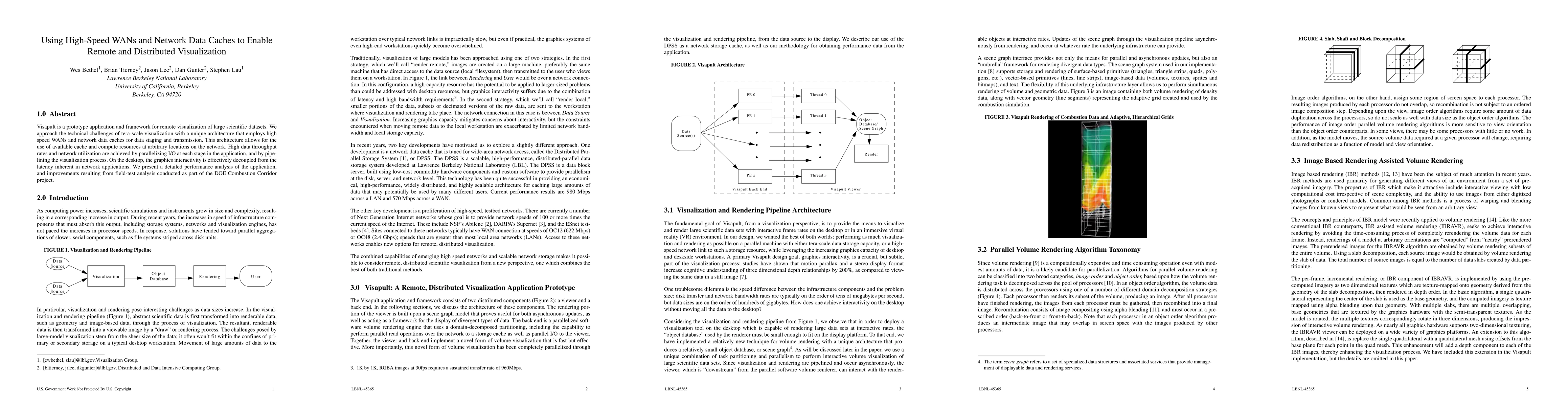 The paper introduces Visapult, a framework for remote visualization of large scientific datasets using high-speed WANs and network data caches. It achieves high data throughput and network utilization by parallelizing I/O and pipelining the visualization process, decoupling graphics interactivity from network latency. Performance analysis and field-test improvements from the DOE Combustion Corridor project are also presented.